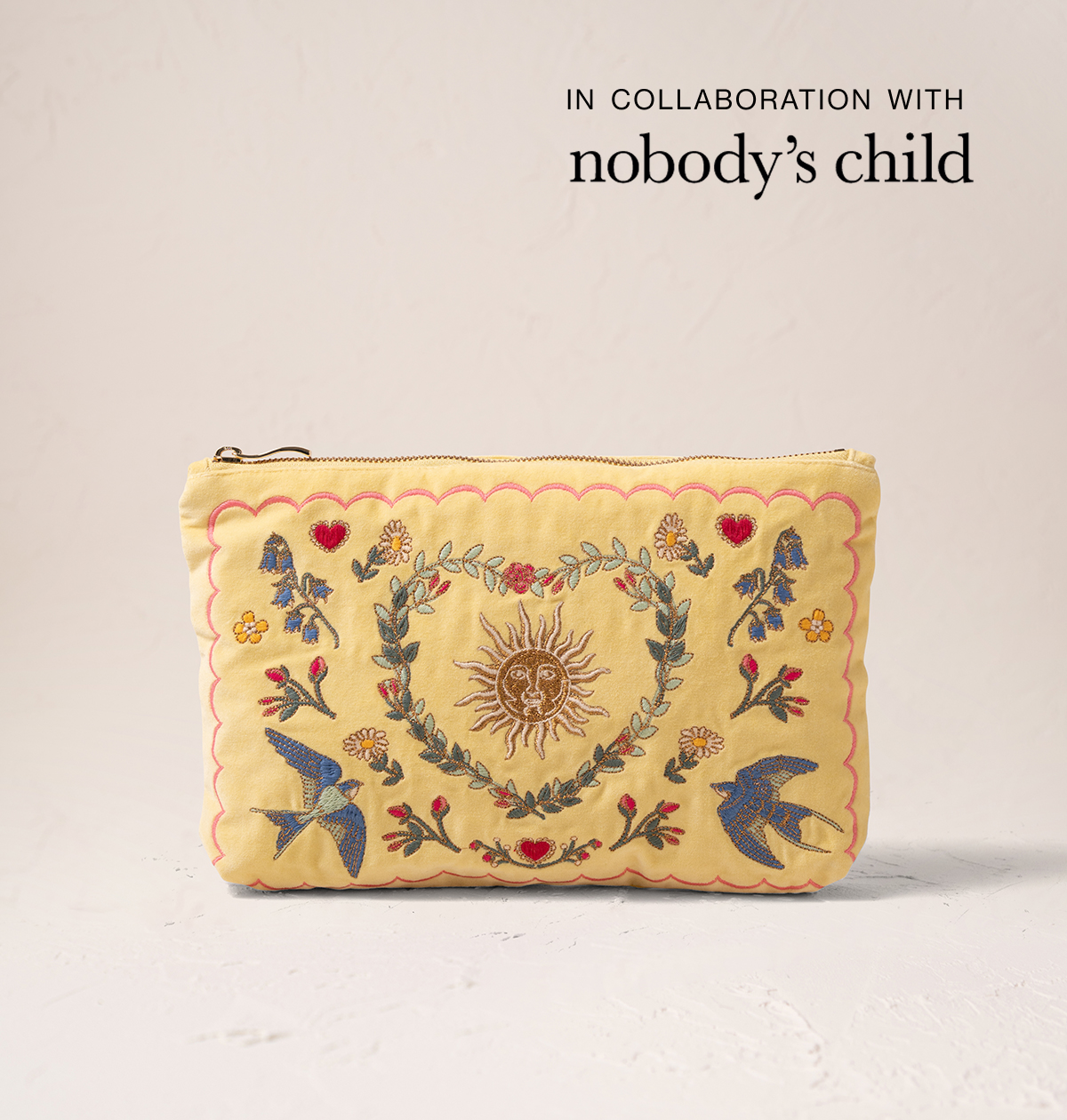 Keep your handbag, beauty and daily essentials perfectly organised with our iconic everyday pouch, or carry it as a clutch for any occasion. Designed in collaboration with Nobody's Child and inspired by a shared love of nature, this design beautifully partners embroidered daisies with Elizabeth's hand-painted print.