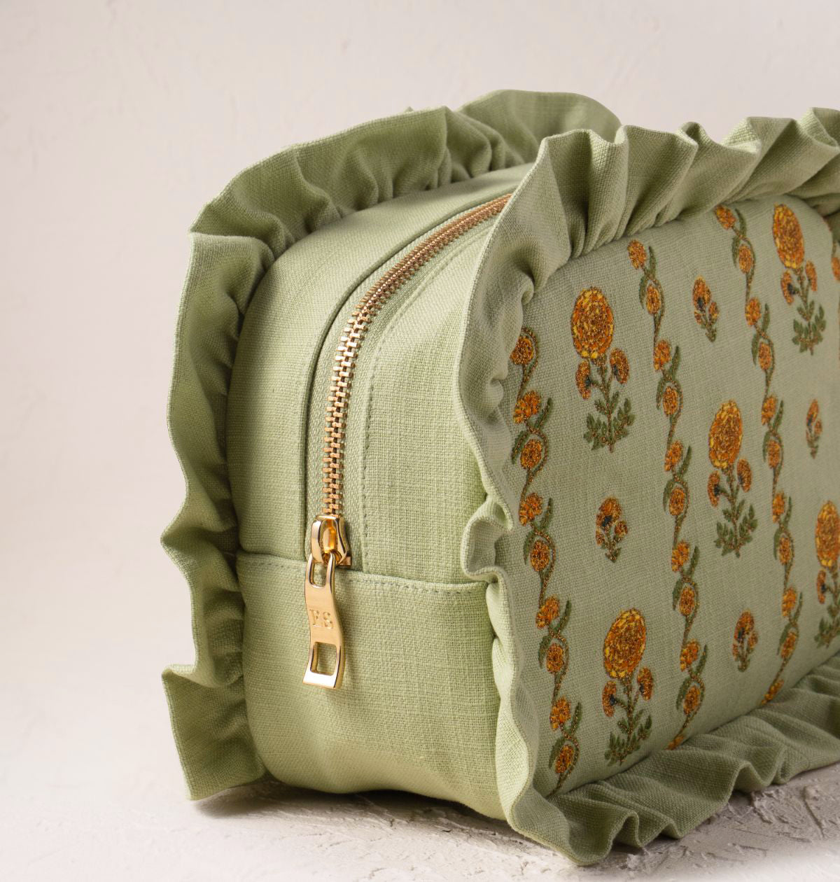 Symbolising light, optimism and growth, these sunny marigolds are perfect for those who set intentions over resolutions. All their details are delicately embroidered in an intricate trellis, ready to brighten beauty organisation or gift with love.