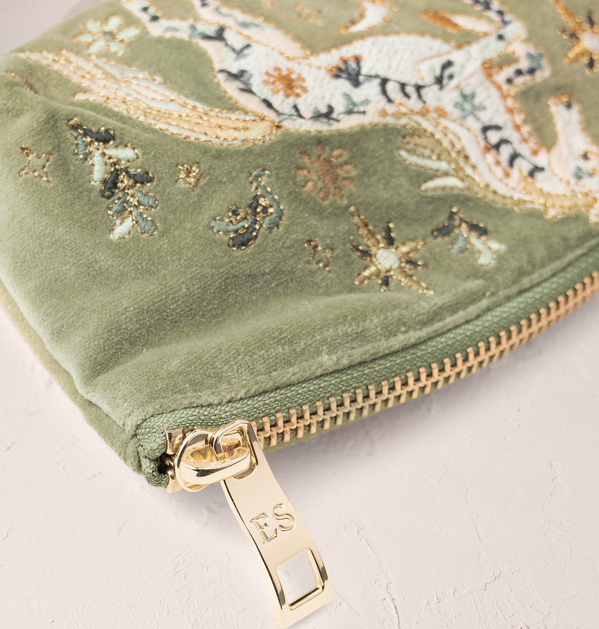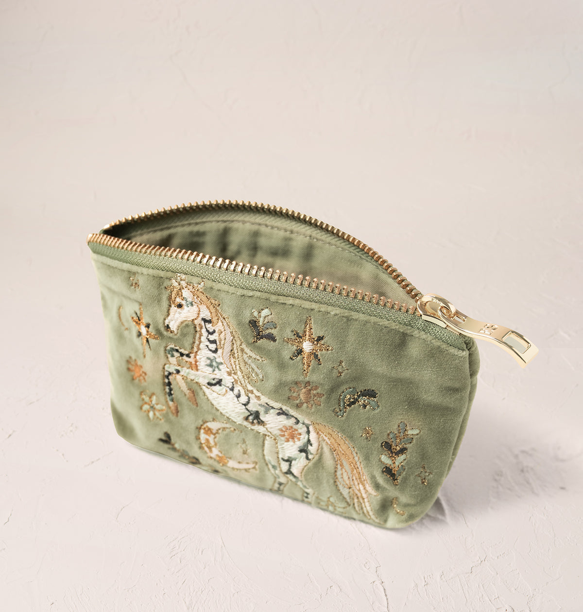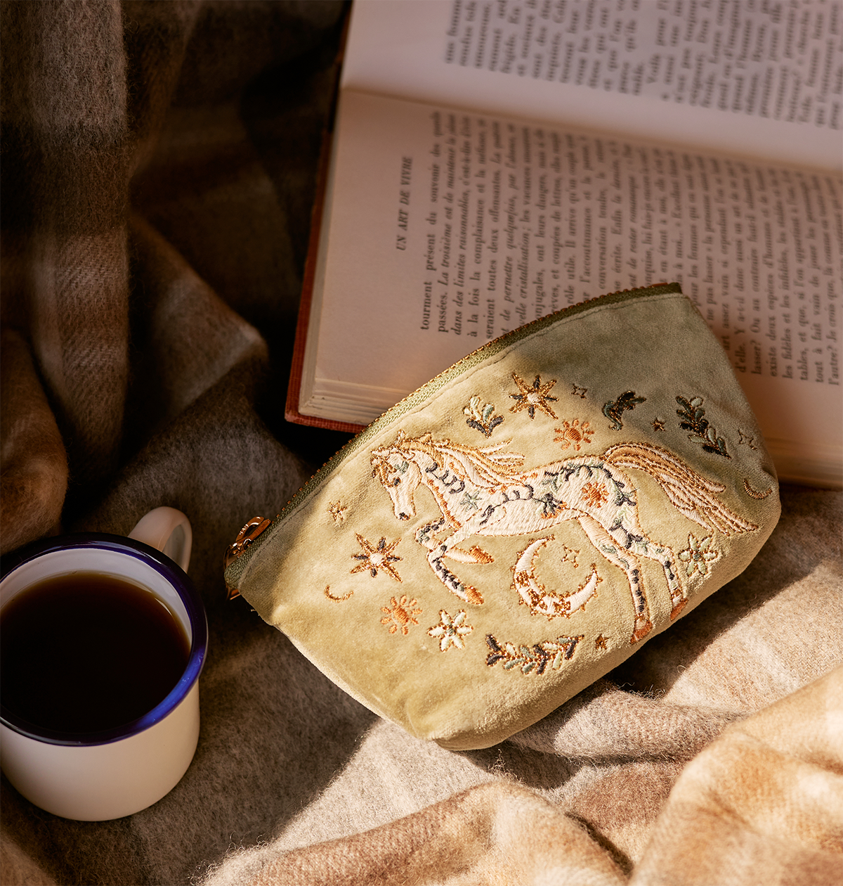 Wild, free-spirited and full of charm, Elizabeth was inspired to create this design by tales of wild horses in myth and Irish folklore. Featuring gold thread embroidery on charcoal velvet, perfect for the wild at heart.