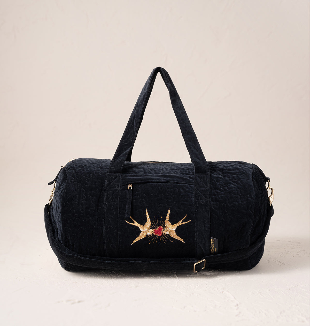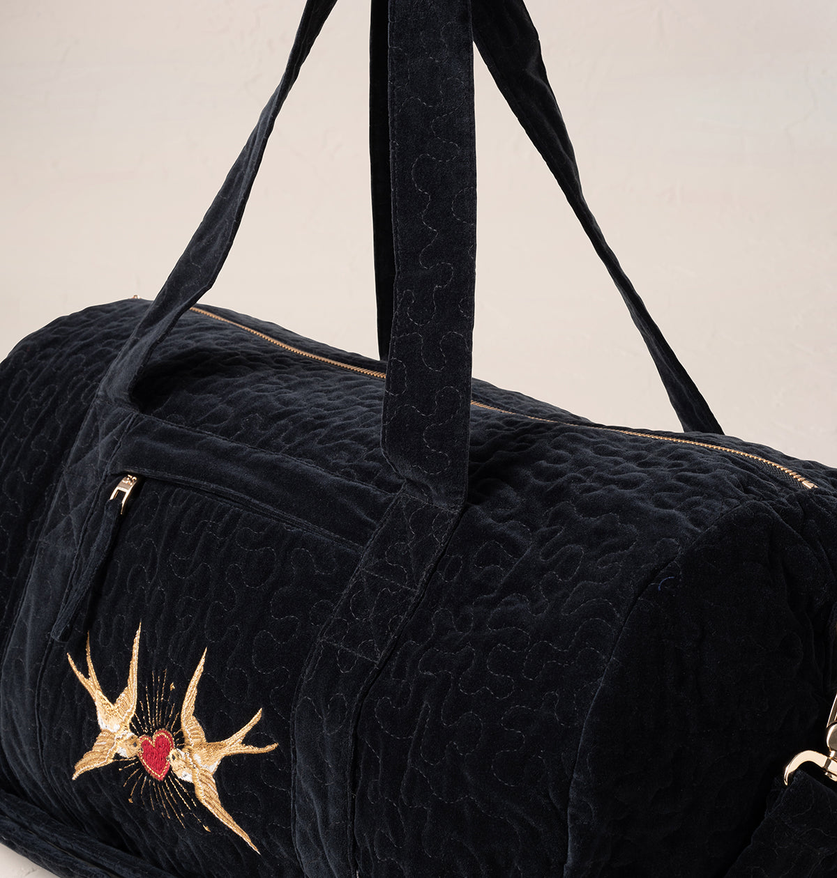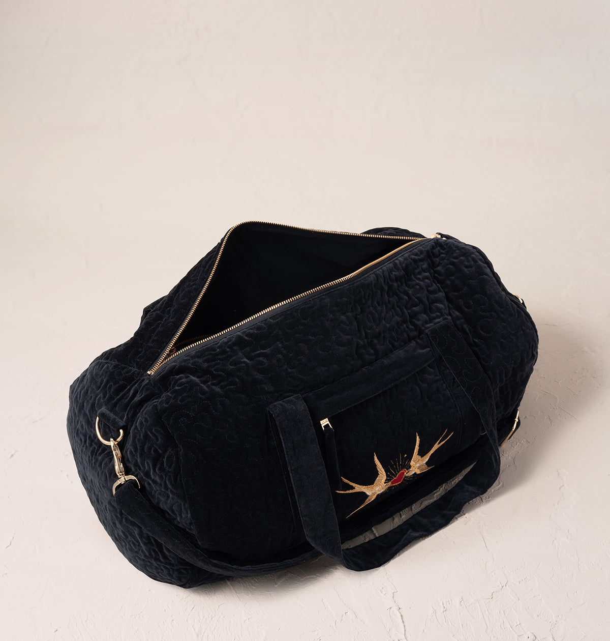 Our Sacred Swallow motif takes on a romantic new meaning, embroidered on a sumptuous velvet base with golden threads. This design carries messages of love, light and harmony, making it the perfect gift for those that mean the most.