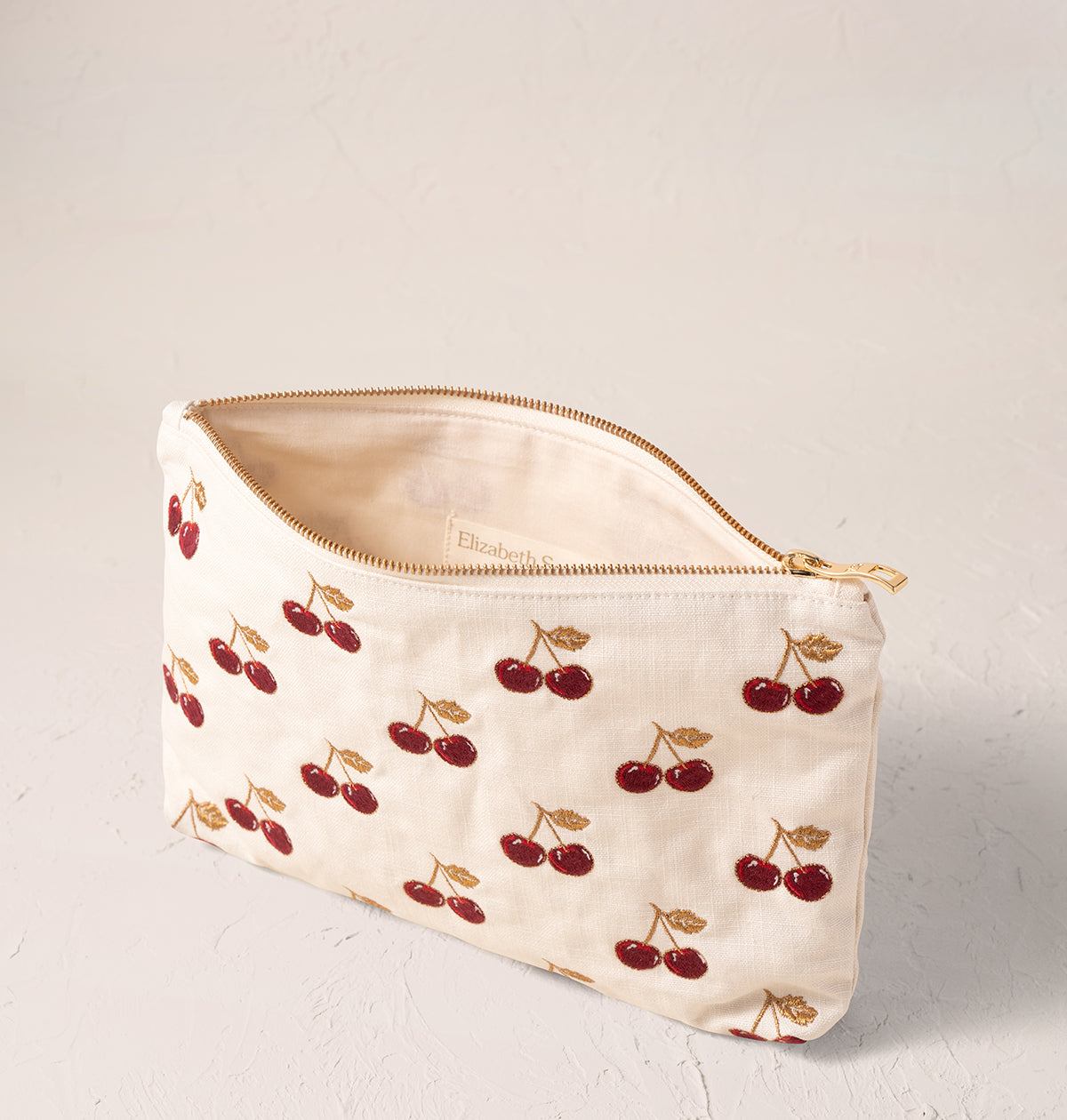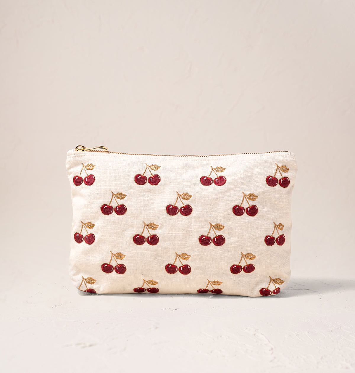 Keep your handbag, beauty and daily essentials perfectly organised with our iconic everyday pouch, or carry it as a clutch for any occasion. Cherry-picked for you and your loved ones, this playful design features crimson embroidered cherries with golden stems - organising your everyday never looked sweeter.