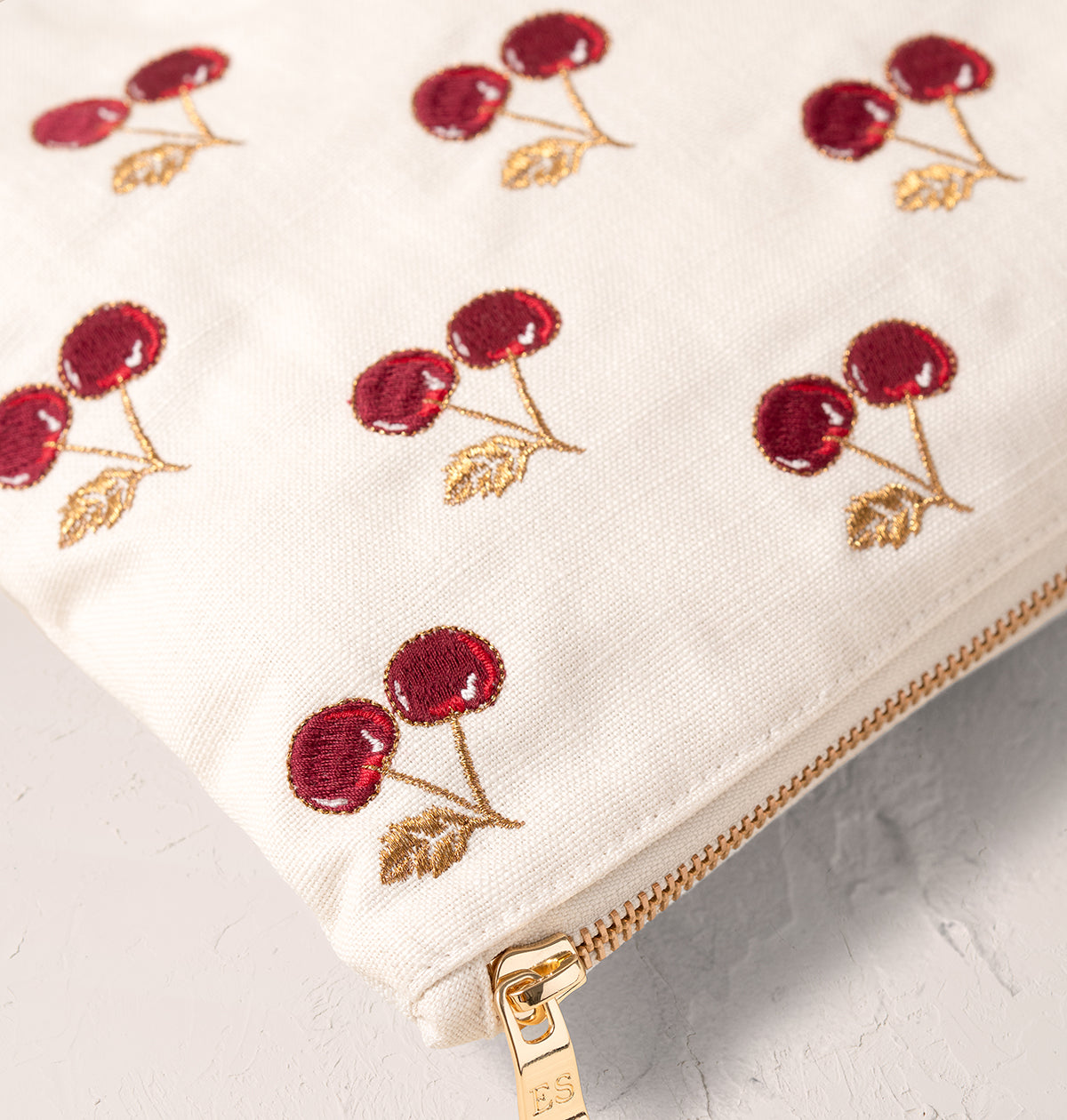 Cherry-picked for you and your loved ones, this playful pouch is embroidered with gold and crimson threads on light cotton canvas - a taste of sweet summer days.
