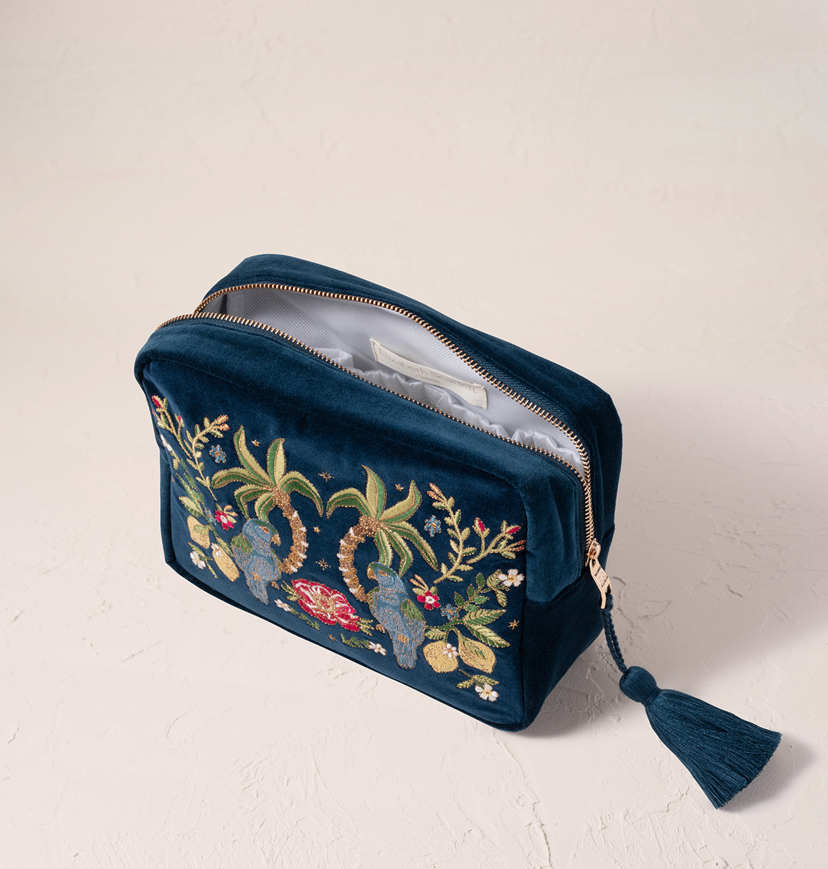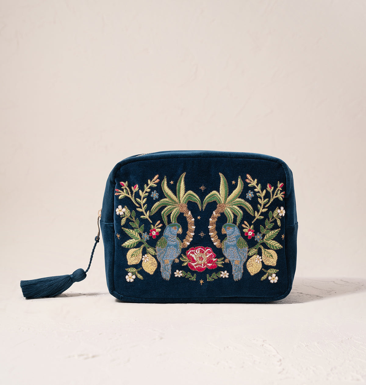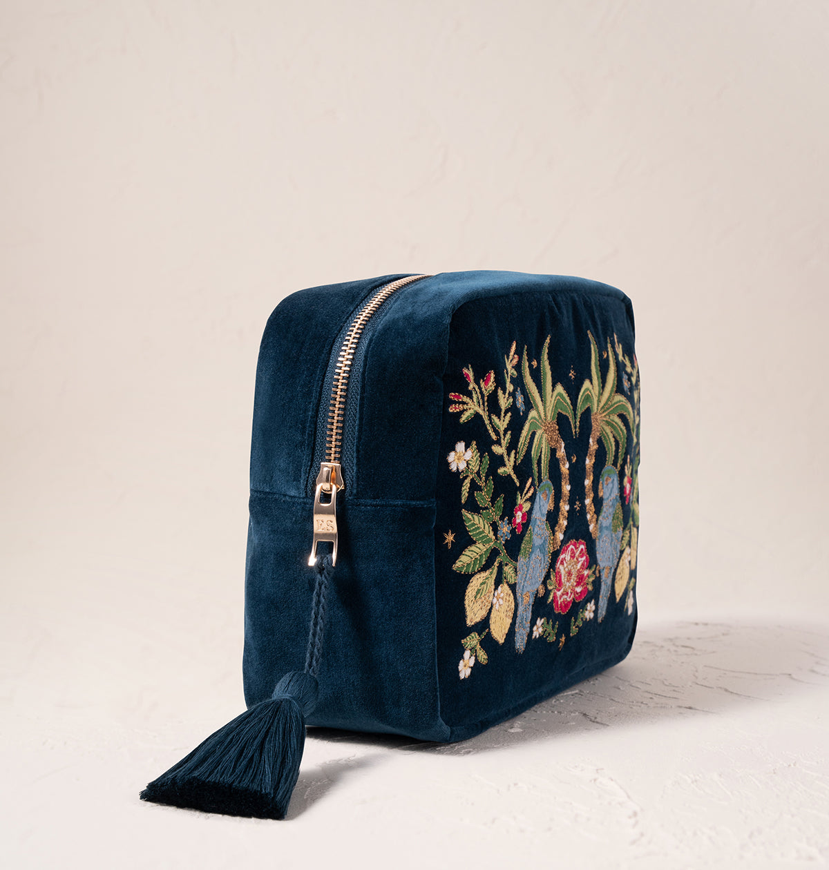 The original bird of paradise, our Parrot is embraced by a blooming jungle backdrop. Finished with twinkling gold threads set against a vibrant velvet base, each piece is set to transport your to exotic climes.