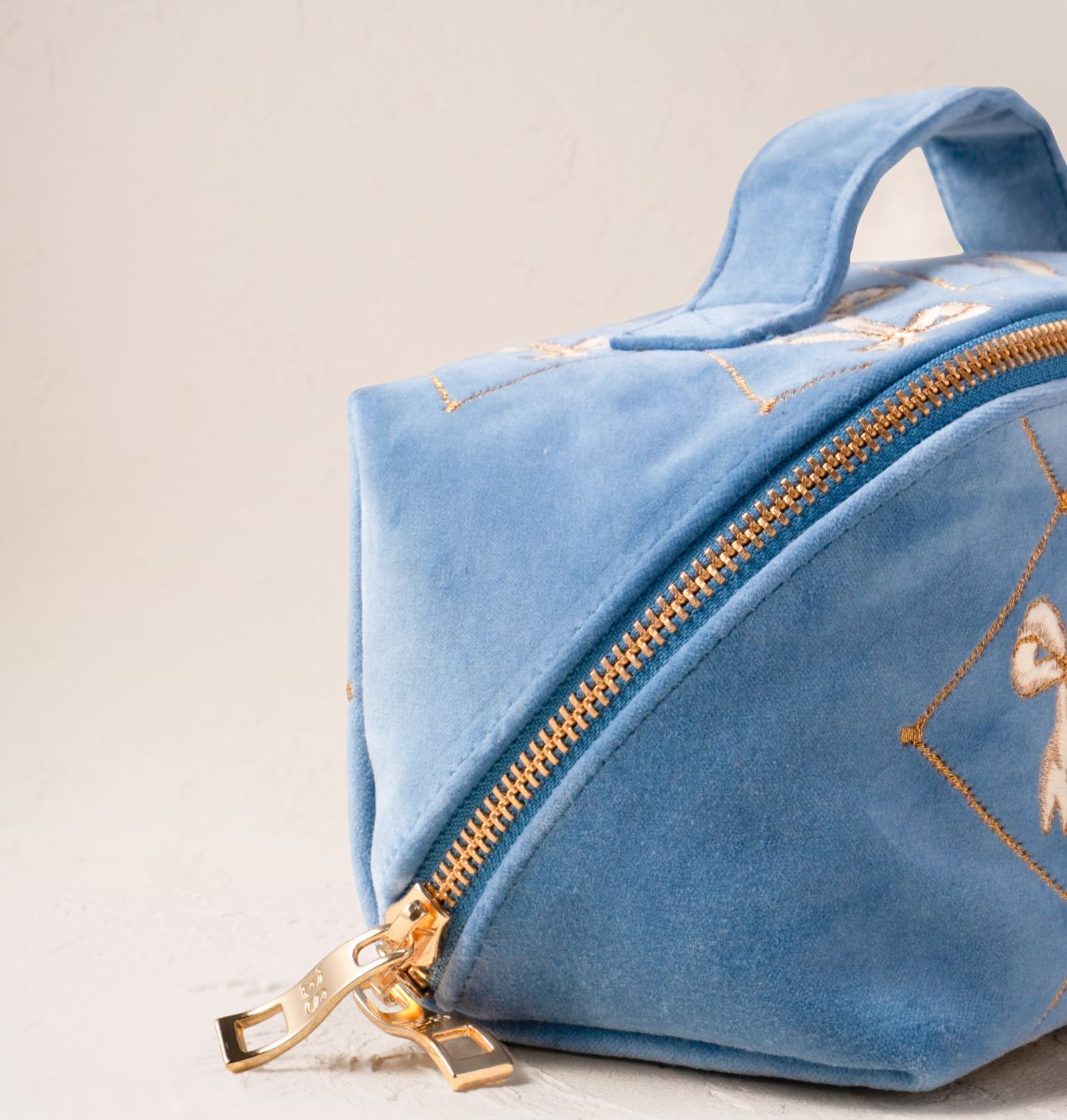 Say goodbye to rummaging and loose lipsticks: this clever makeup bag lays flat on any surface to reveal your full routine, beautifully laid out. Something blue, and beautifully hers, gift delicately-embroidered bows on blue velvet – the perfect treasure for any bride-to-be.