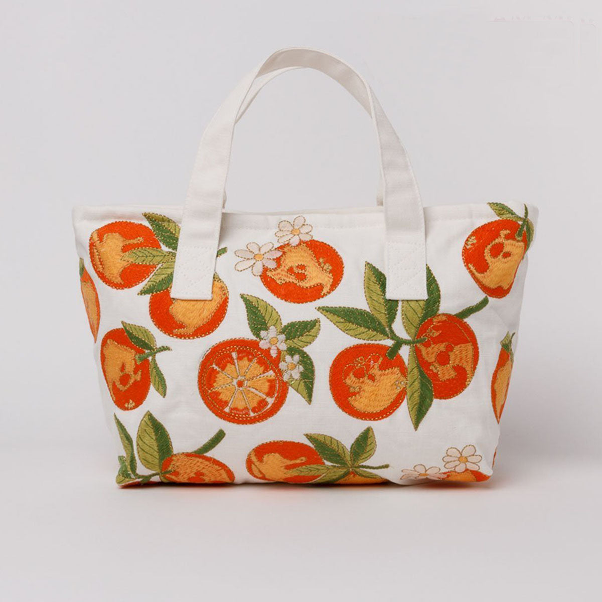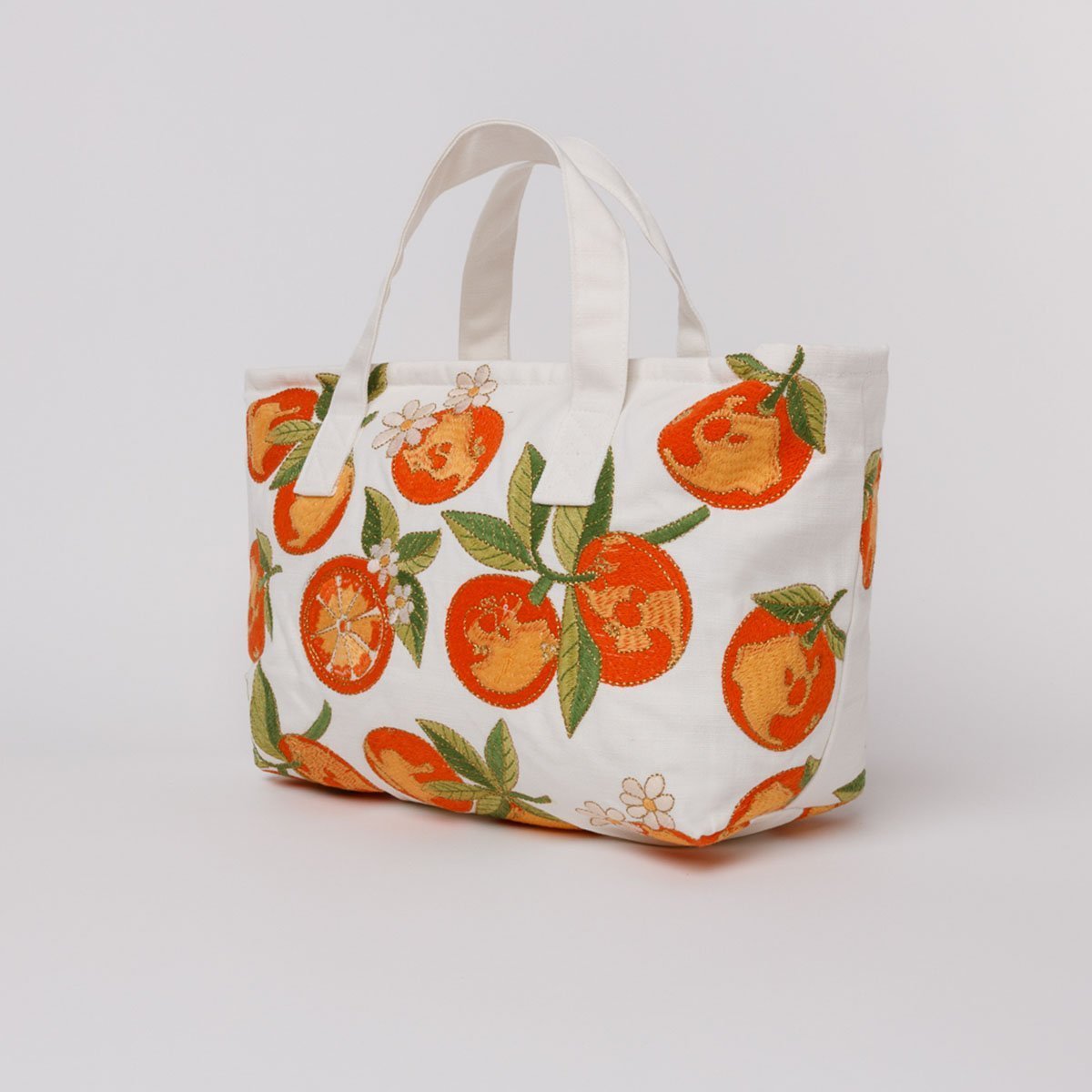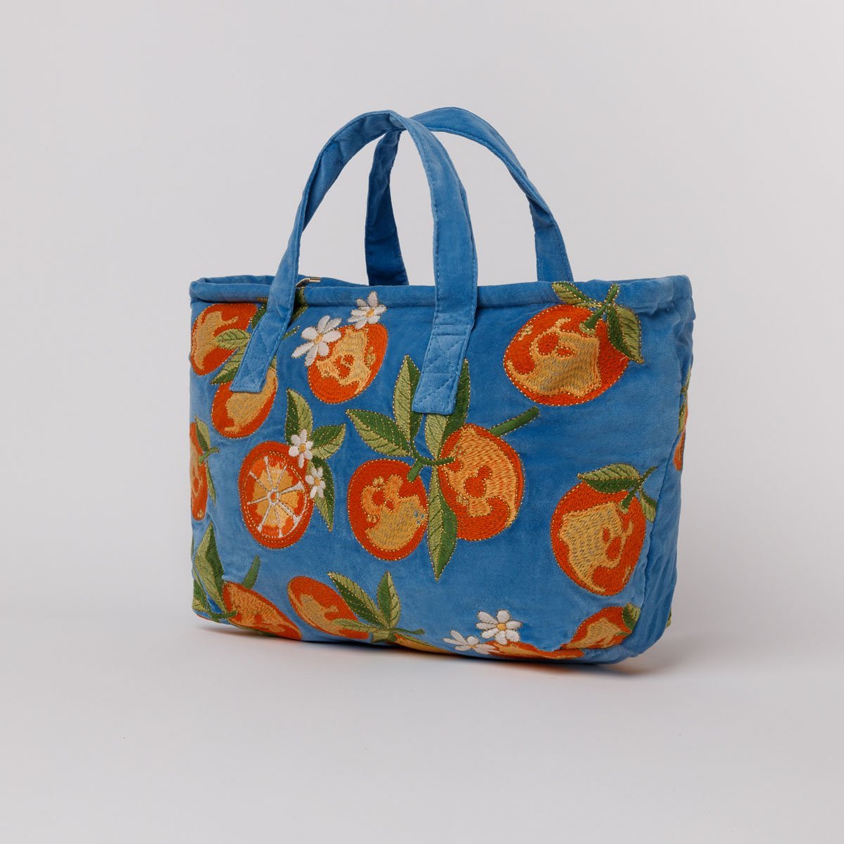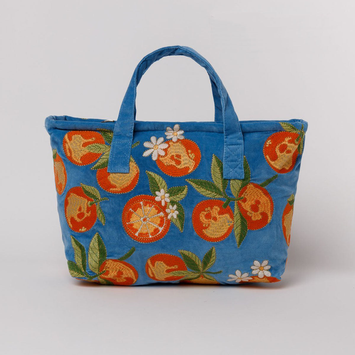 This day bag features a brightly orange blossom design delicately embroidered onto a soft blue velvet or white cotton base. Capturing all the details with gold accents, this bag is ideally sized to hold all of your essentials for a day in town.