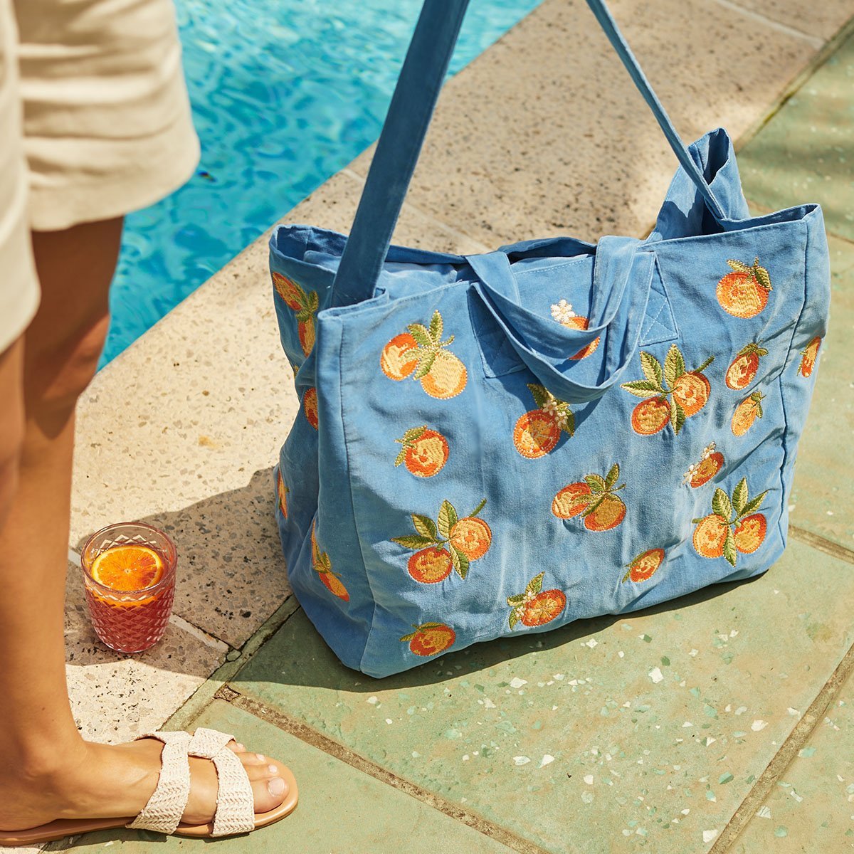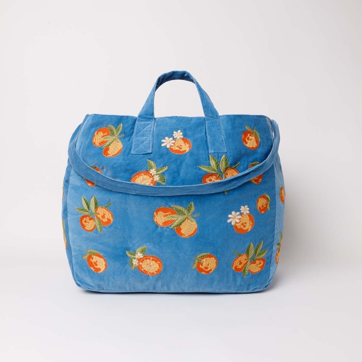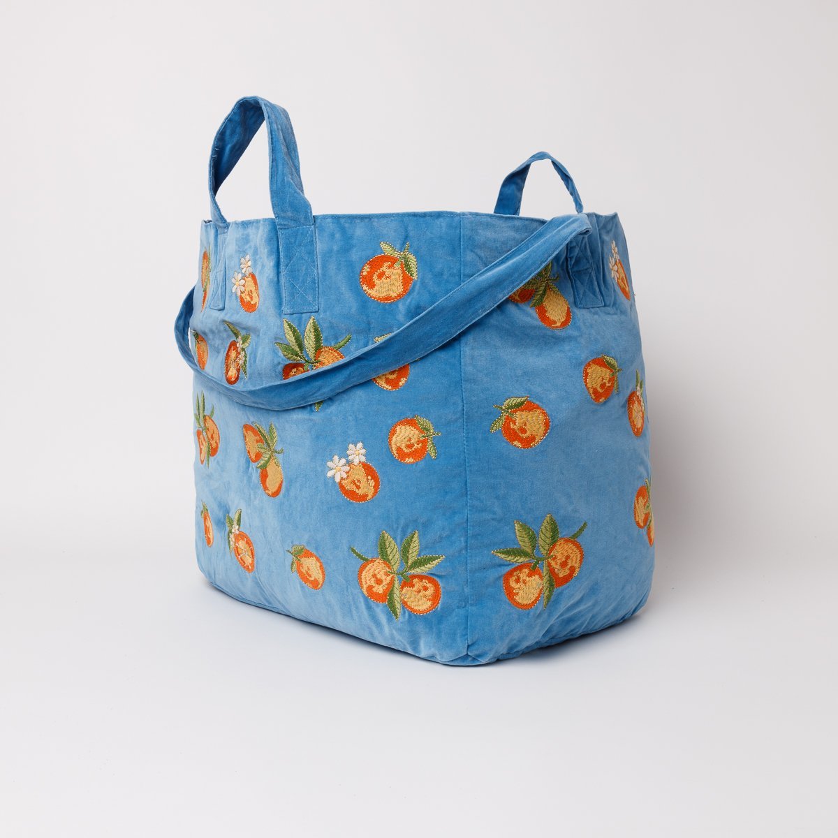 The tote bag features hand illustrated orange blossom embroidered onto a rich blue velvet base. Ideally sized, this multi-way bag is designed to hold all your dreamy summer essentials, perfect for a trip to the beach or a picnic in the park.