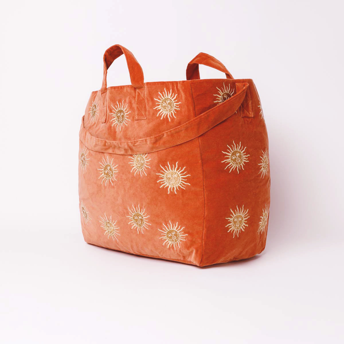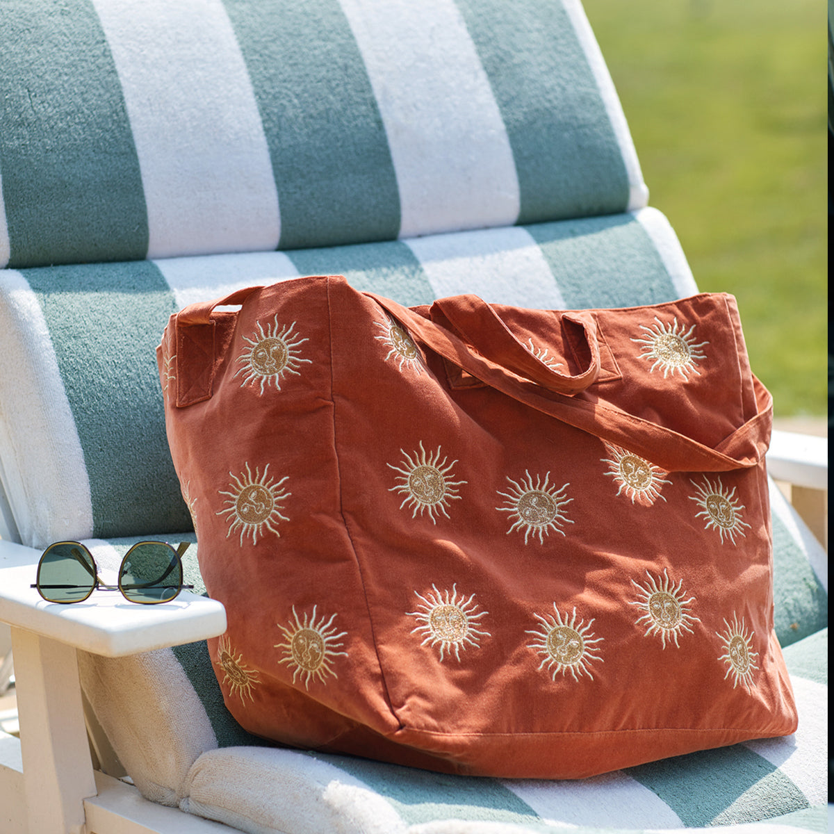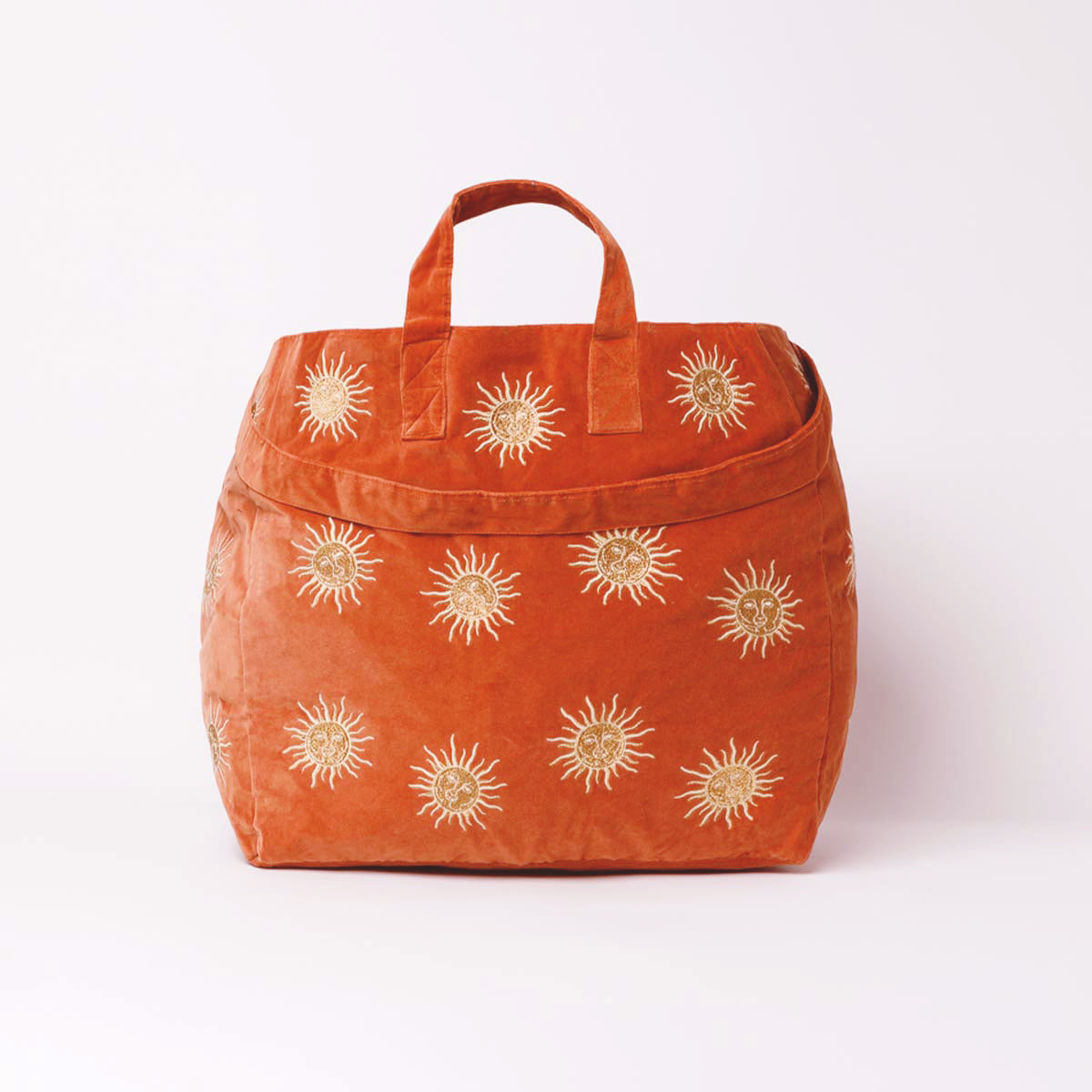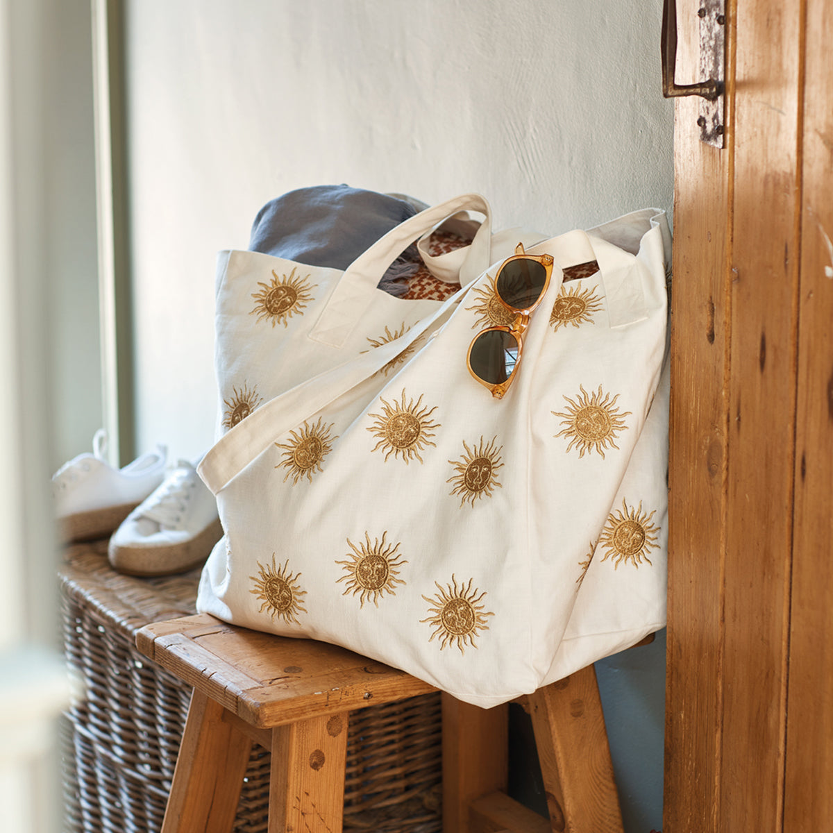 Pack for dreamy day trips, weekend escapes, or popping to the gym with this roomy, quilted tote bag featuring pockets for organisation and a secure gold zip closure. Featuring Elizabeth's hand-drawn sun motif, embroidered in vanilla and gold threads with a human-like face that imagines our most powerful star as a gentle being radiating warmth and light.
