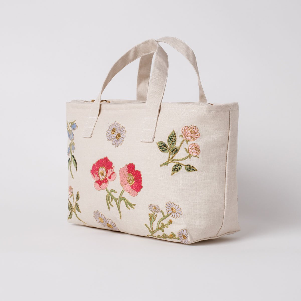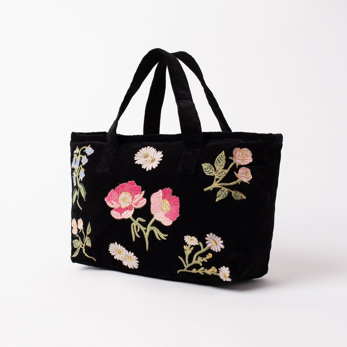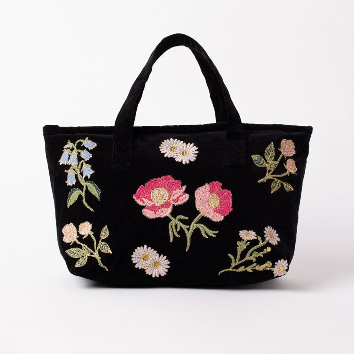 This Day Bag features delicate embroidery on a luxurious velvet base. Capturing all the details with gold accents, it is ideally sized to hold all of your essentials for a day in town.