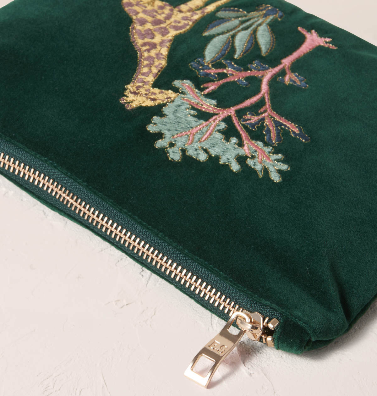 This vibrant and detailed design was inspired by the elegant, long-legged creatures that Elizabeth saw grazing on the plains of Kenya during her honeymoon safari. The design details the creature's unique pattern, and majestic form, along with the leafy green habitat amongst which they graze.