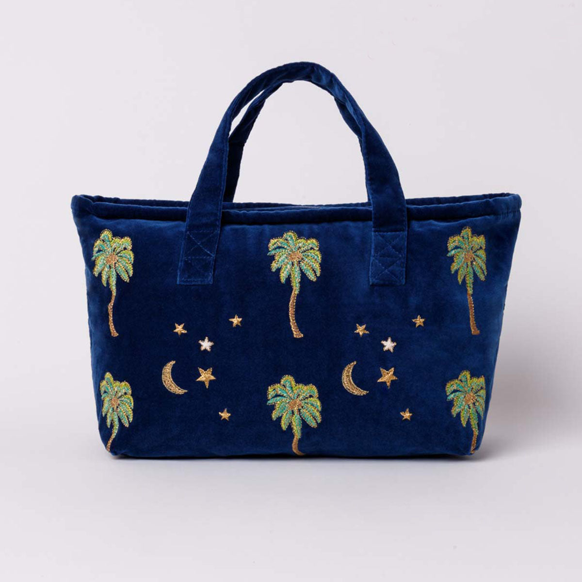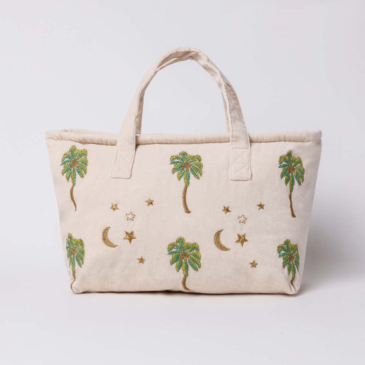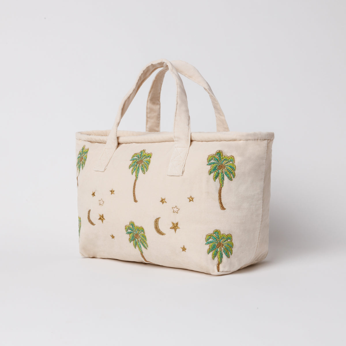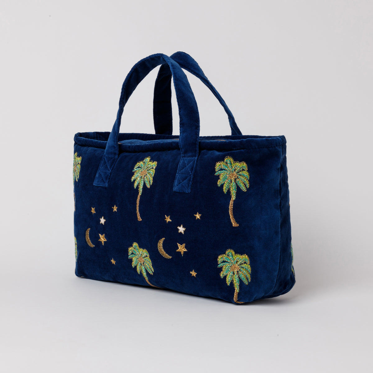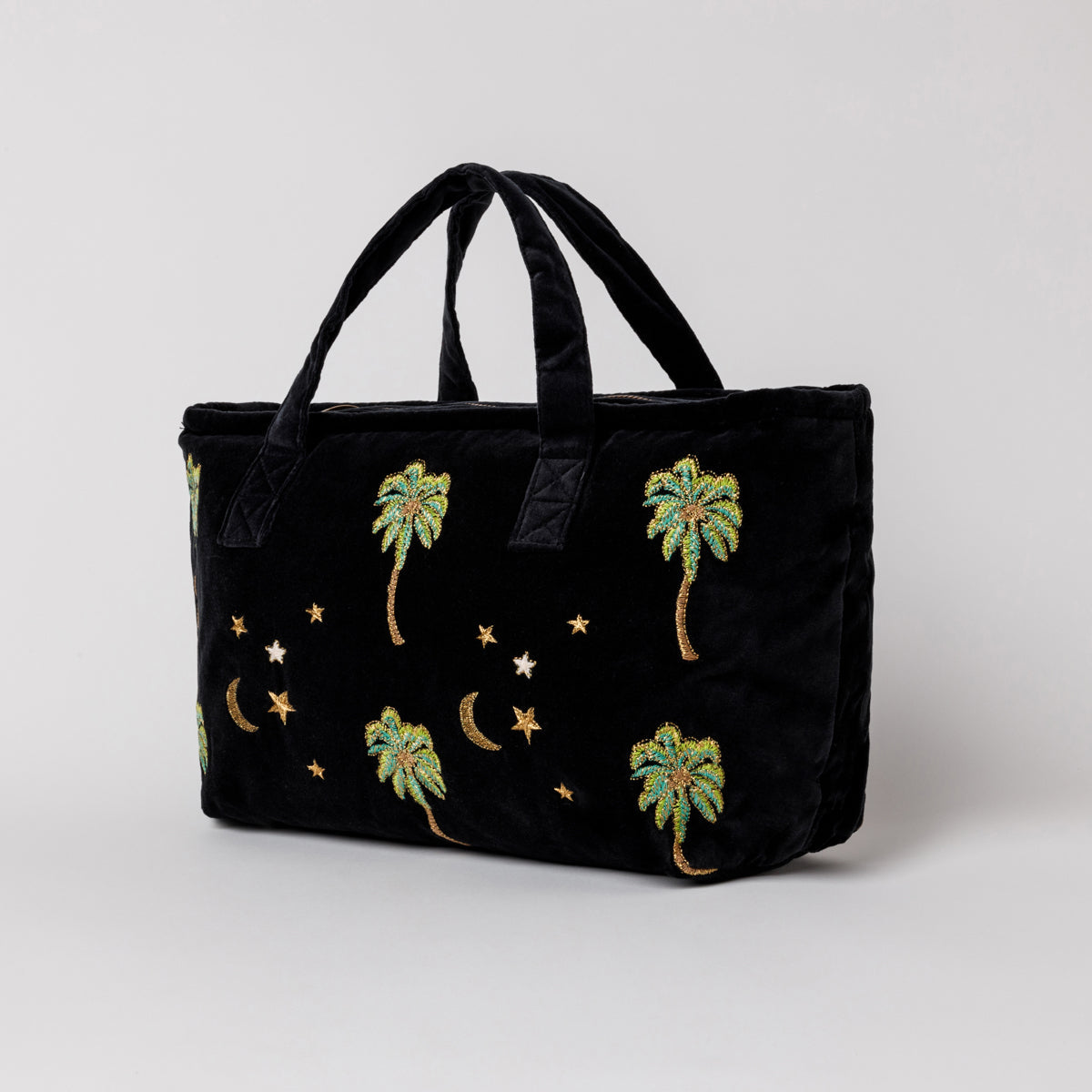 Reminiscing on her travels around East Africa, Elizabeth created this design to reflect magical nights in the Savannah, sat around the crackling campfire, and gazing up at the midnight sky, lit up with twinkling stars. The motif features hand-illustrated green and gold palm trees embellished with golden stars and moons.