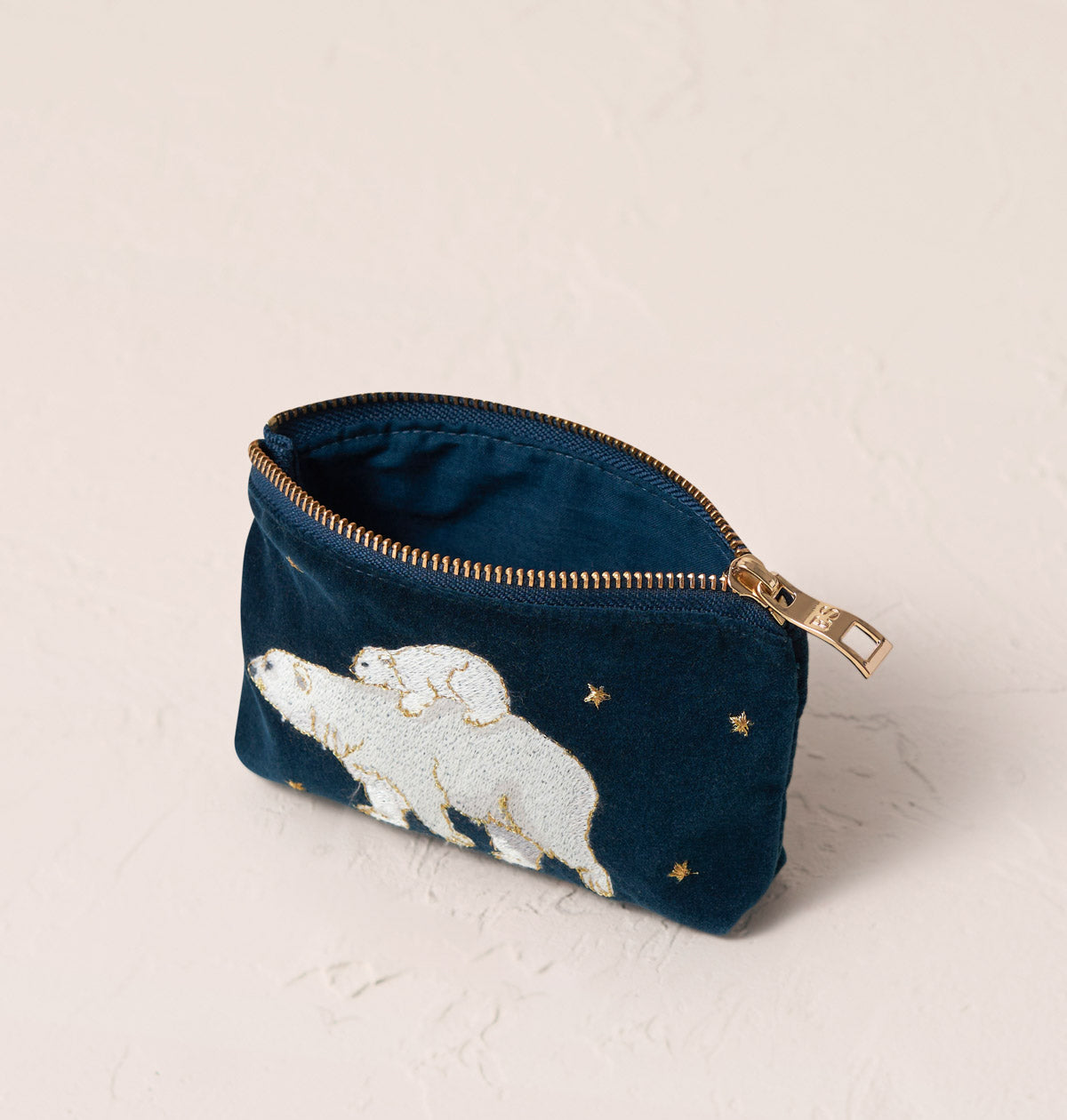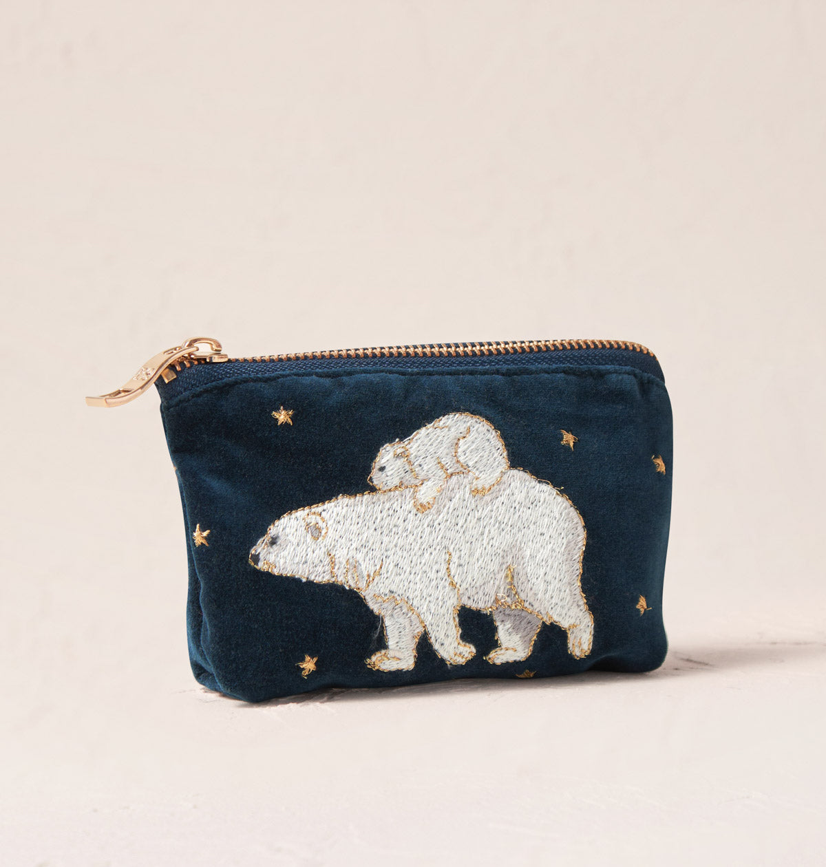 An exclusive Christmas design, featuring a mama bear and her cub, this magical design is inspired by the journey of these majestic creatures, side by side. A luscious deep velvet base finished with white & gold embroidery.