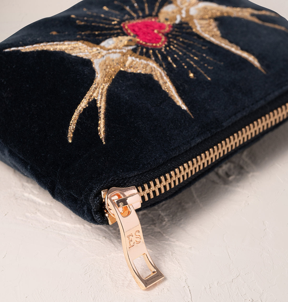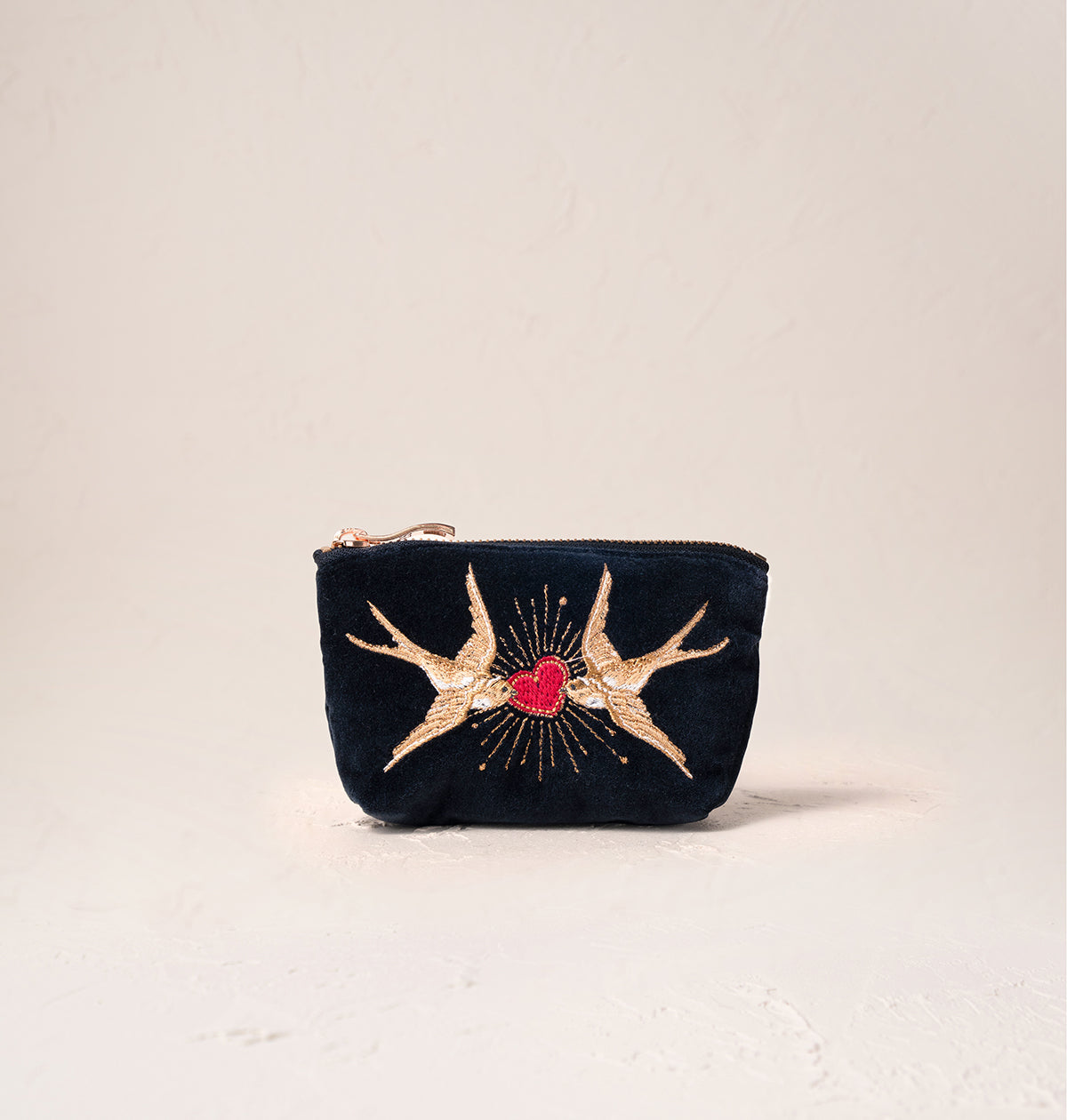 Keep your smaller treasures safe and stylish, with a golden zip that makes paying for your morning coffee a little more joyful. Featuring Elizabeth's iconic swallow motif, this design captures their beauty and character with hints of gold as they dip and swoop through the skies.