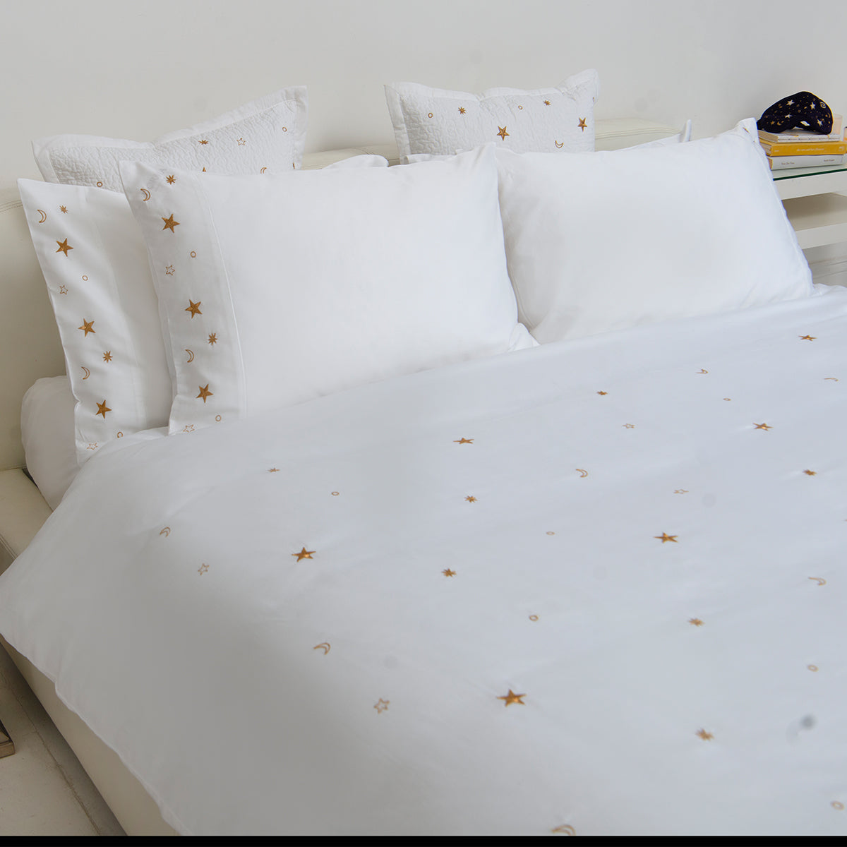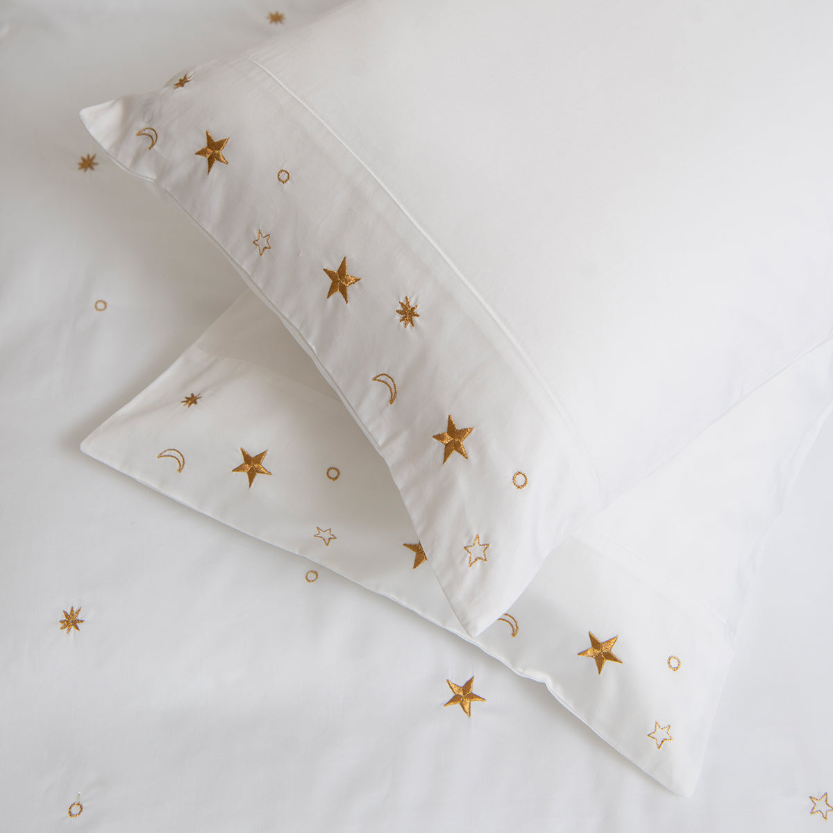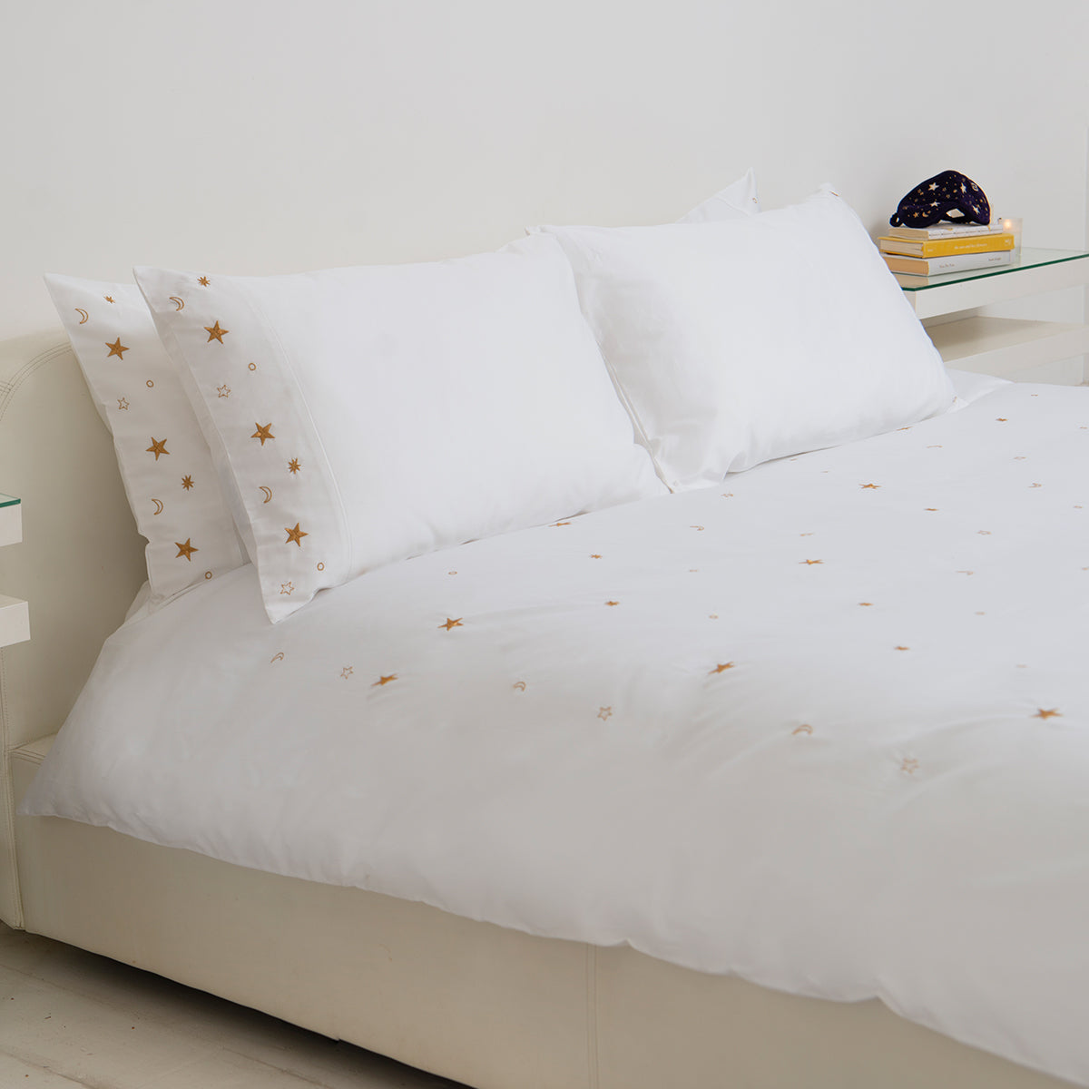 Constellations is our luxuriously soft 100% cotton sateen bed linen made to hotel quality standard. Our signature golden Elizabeth Scarlett stars and moons have been delicately embroidered onto a smooth 300 thread-count base. The set includes a duvet cover with two standard pillowcases for a dreamy night sleep under the stars.