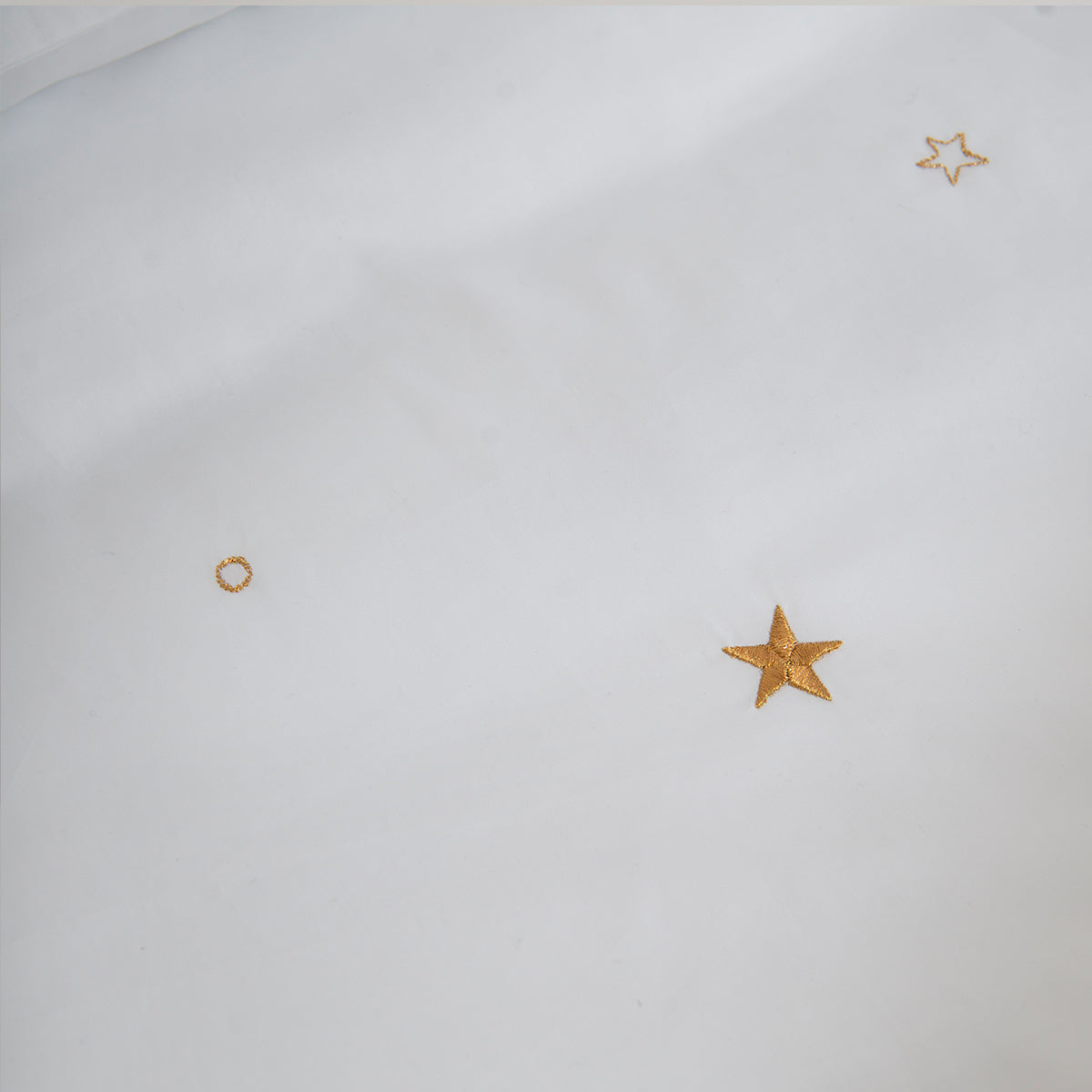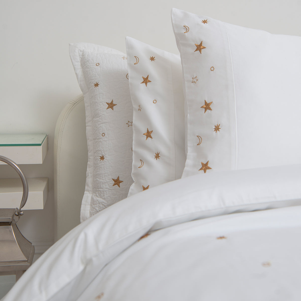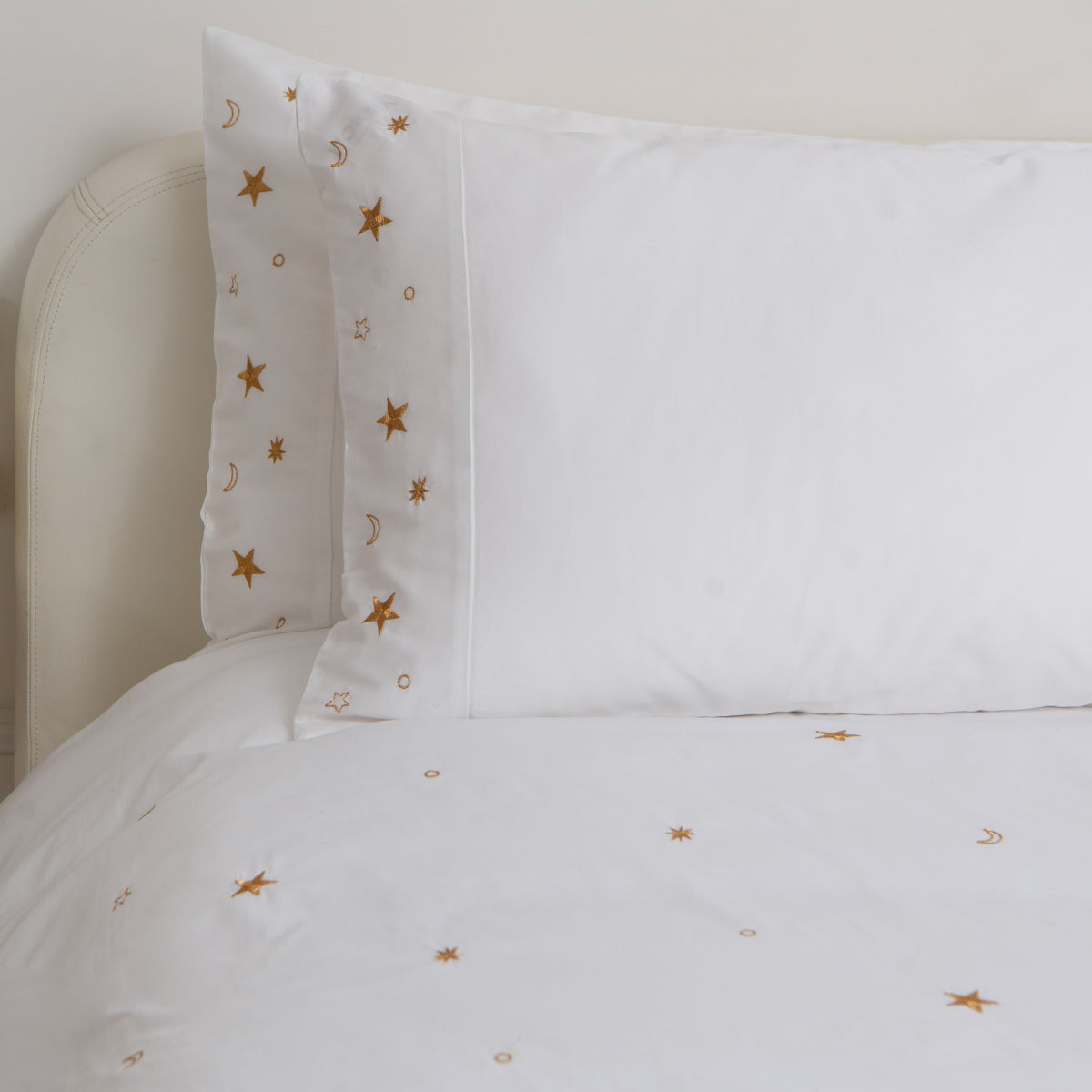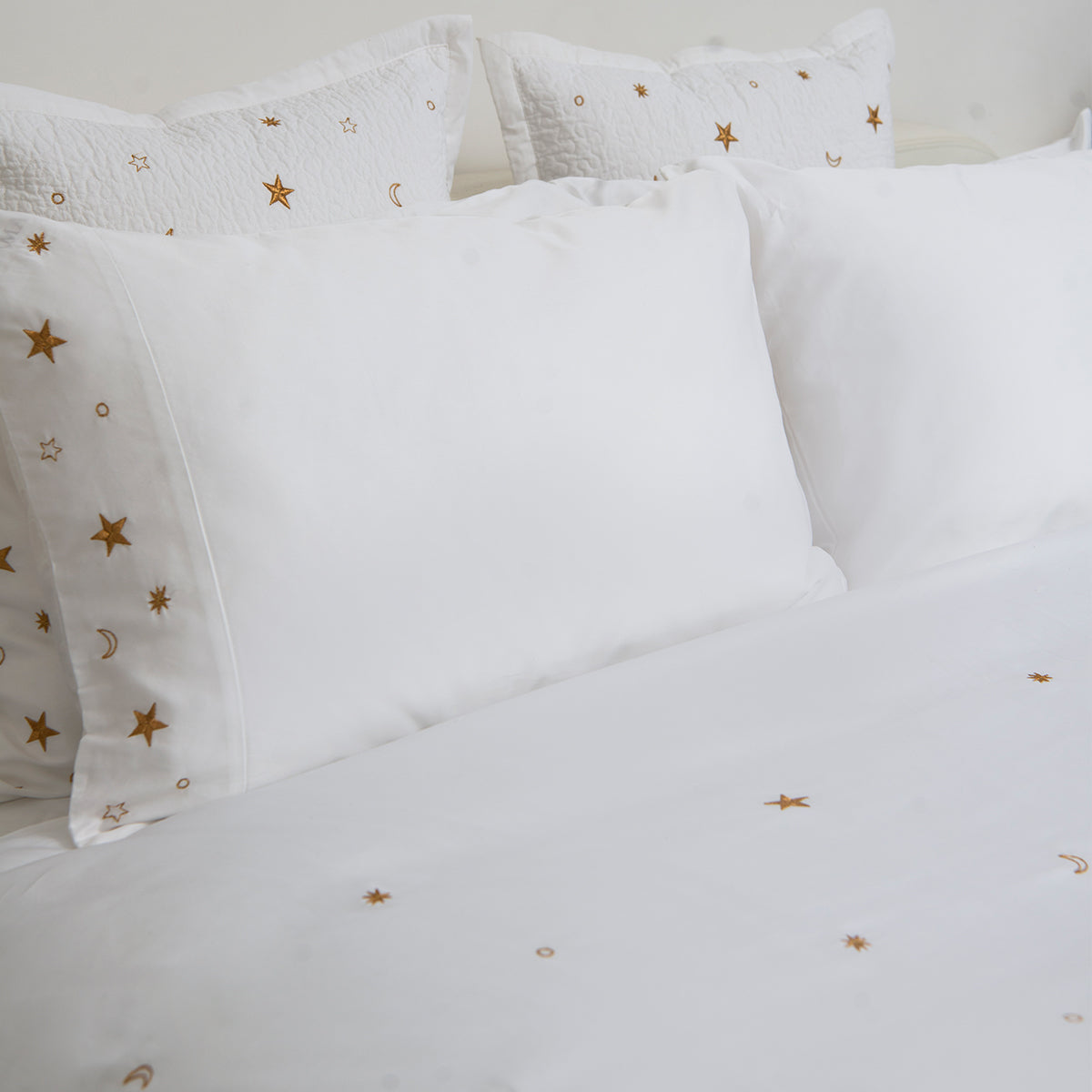Constellations is our luxuriously soft 100% cotton sateen bed linen made to hotel quality standard. Our signature golden Elizabeth Scarlett stars and moons have been delicately embroidered onto a smooth 300 thread-count base. The set includes a duvet cover with two standard pillowcases for a dreamy night sleep under the stars.