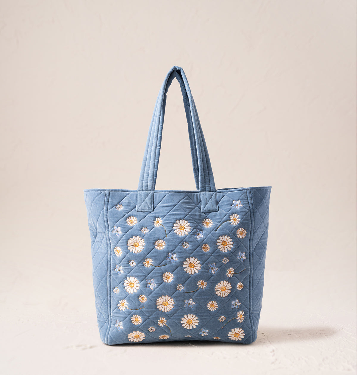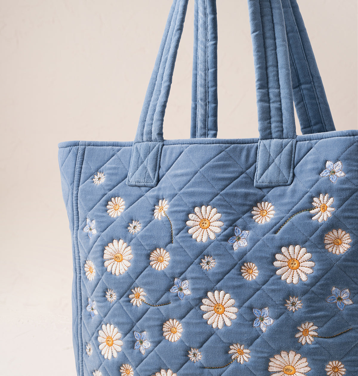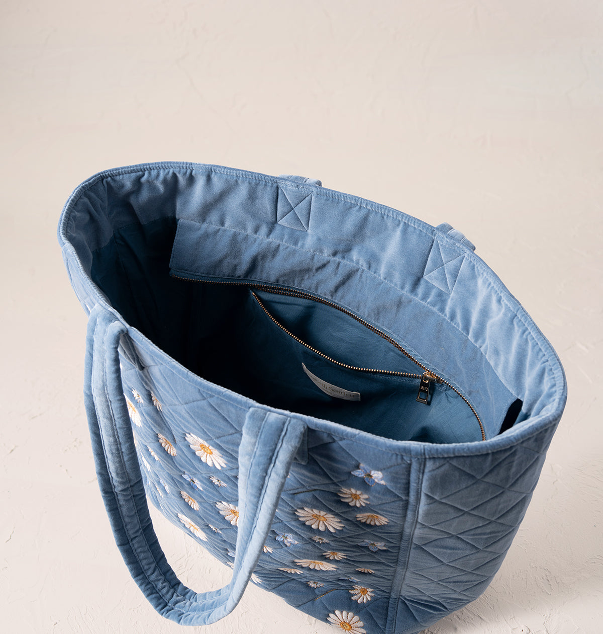 Pack for dreamy day trips, weekend escapes, or popping to the gym with this roomy, quilted tote bag featuring pockets for organisation and a secure gold zip closure. Featuring sweet daisies and forget-me-not details embroidered on a sky-blue base to honour the iconic wildlflower that brightens meadows and fields.