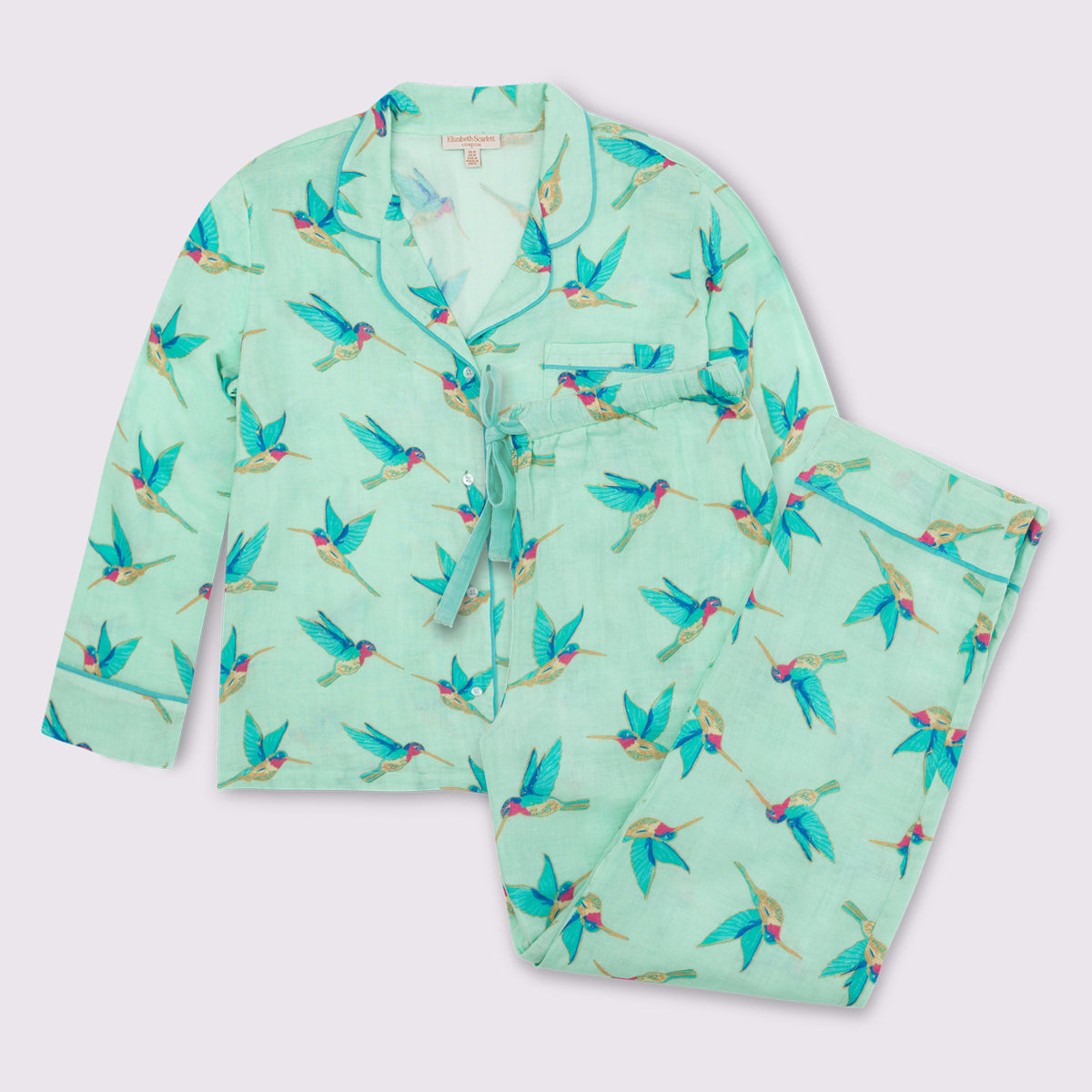 Crafted from light-as-air 100% cotton sateen, our Pyjamas feature a classic button-down shirt and relaxed fit, designed for the dreamers among us. Showcasing jewel-like Hummingbirds with delicate embroidery and gold threads against a sumptuous velvet base.