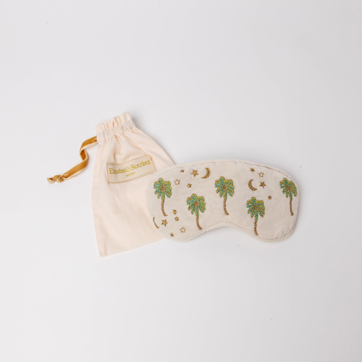 Reminiscing on her travels around East Africa, Elizabeth created this design to reflect magical nights in the Savannah, sat around the crackling campfire, and gazing up at the midnight sky, lit up with twinkling stars. The motif features hand-illustrated green and gold palm trees embellished with golden stars and moons.