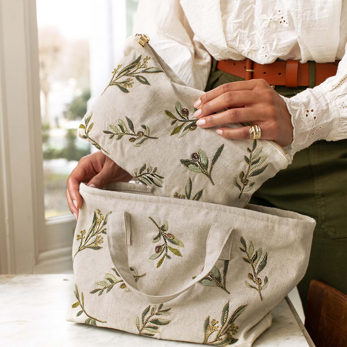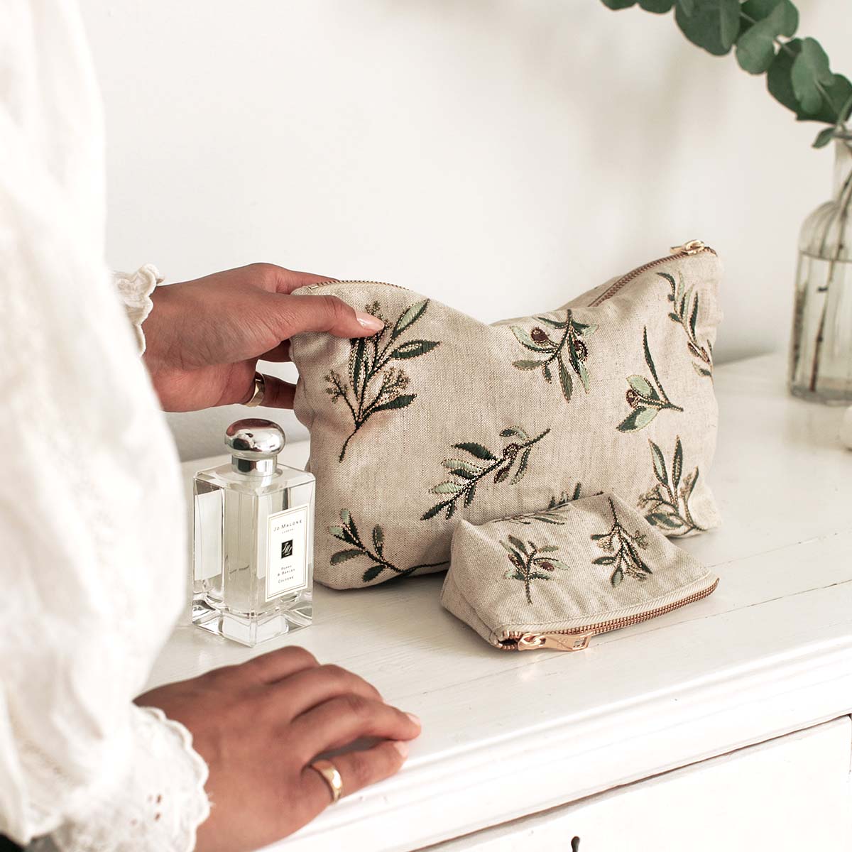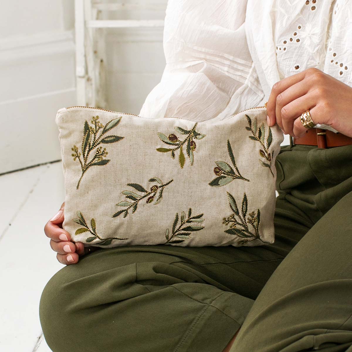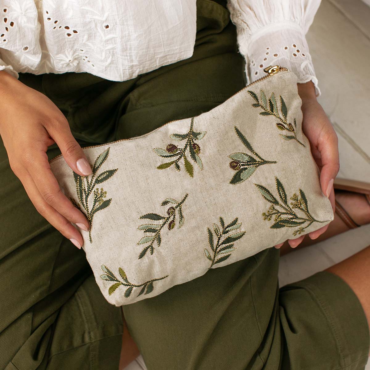 Designed to make your life a little more organised and a lot more luxurious, this timeless Pouch features delicately embroidered olive branches onto a light linen base. Ideally sized, it is perfect for storing your daily essentials, fitting in your handbag, or using as a clutch.