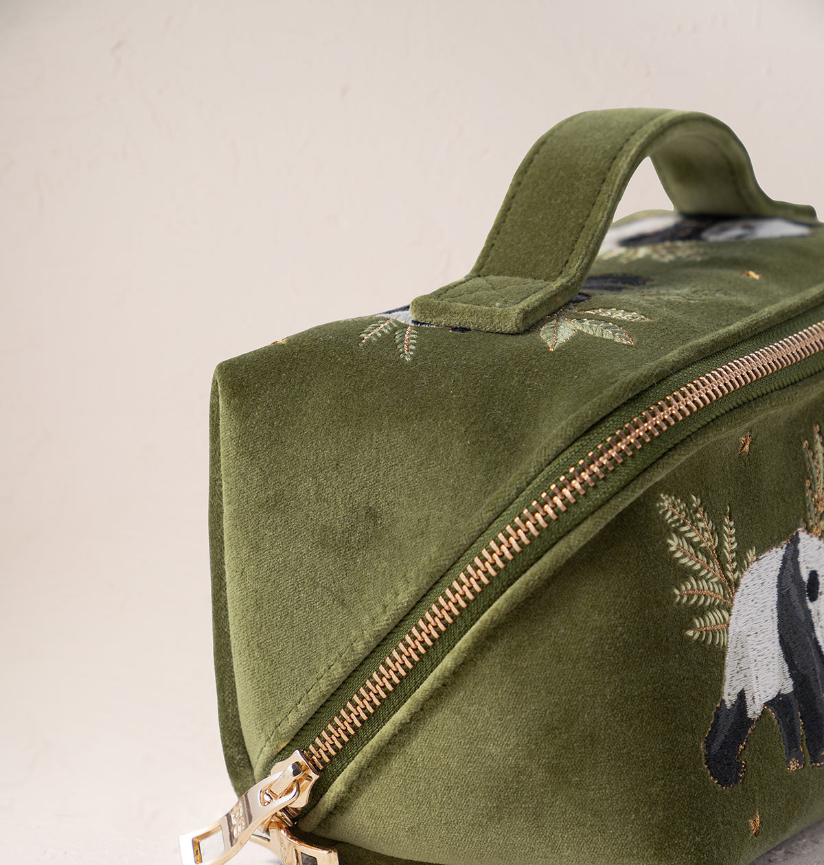 Nestled amongst bamboo, this heartwarming design honours the gentle panda. Embroidered on soft khaki velvet dotted with branches and stars, this design serves as a reminder to embrace the lighthearted fun in each and every day.