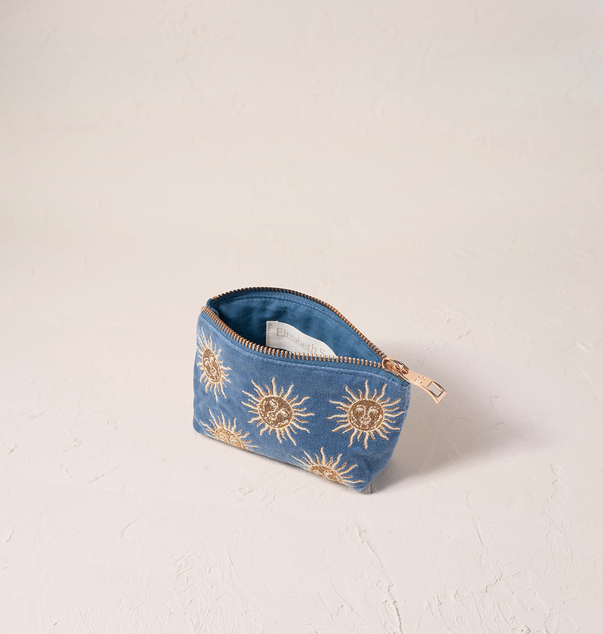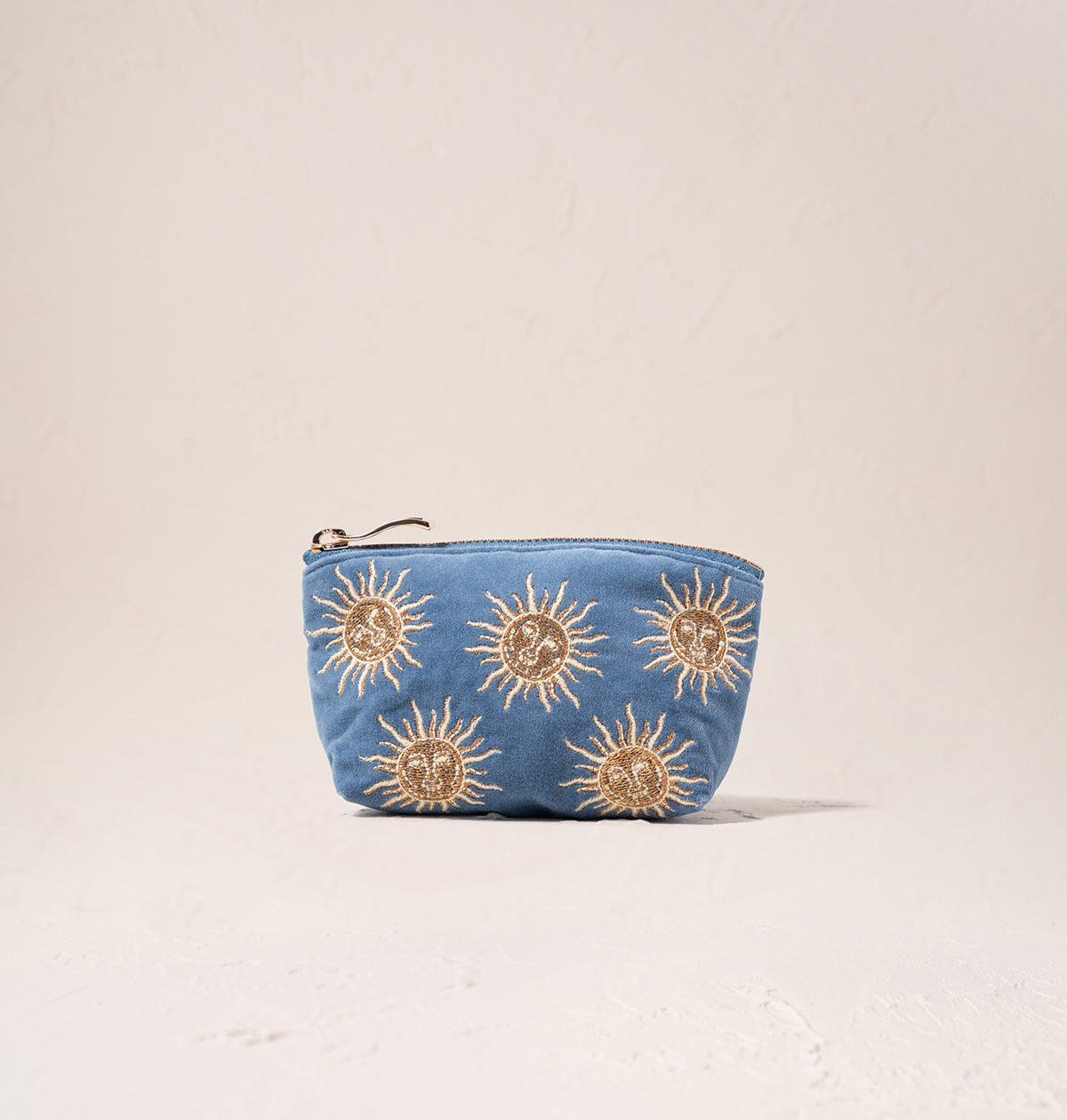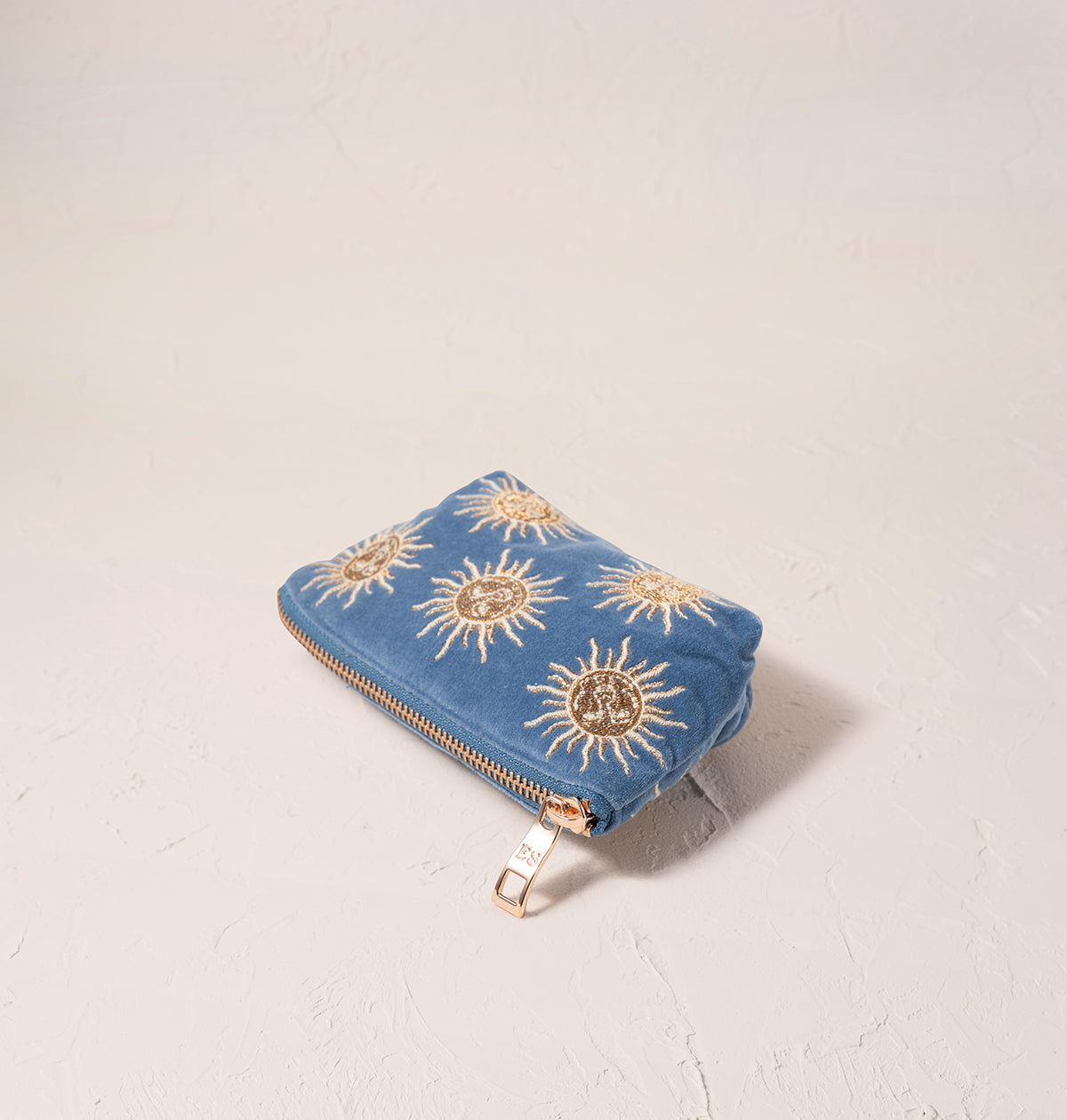 Keep your smaller treasures safe and stylish, with a golden zip that makes paying for your morning coffee a little more joyful. Featuring Elizabeth's hand-drawn sun motif, embroidered in vanilla and gold threads with a human-like face that imagines our most powerful star as a gentle being radiating warmth and light.