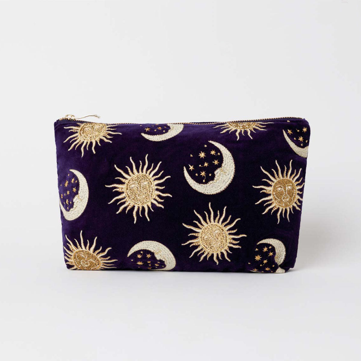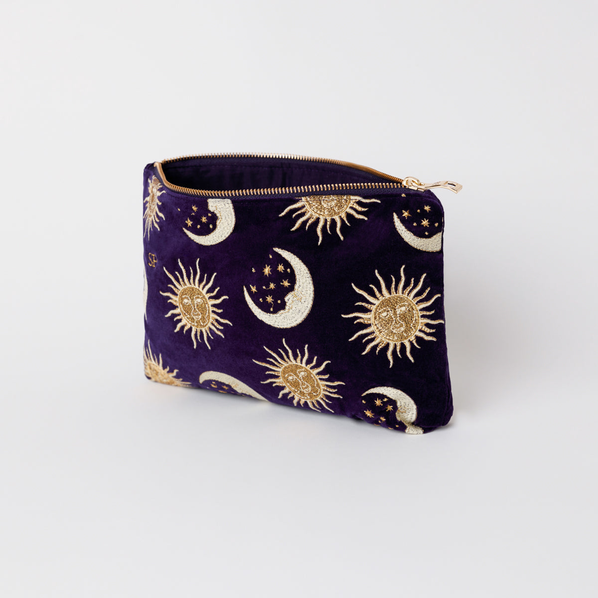 Inspired by the majestic moon and the warm wonders of the sun, this design promises to inject a little cosmic power into your everyday. The new motif translates Elizabeth's original illustrations into delicately embroidered cream and golden threads, standing out against a rich velvet base.