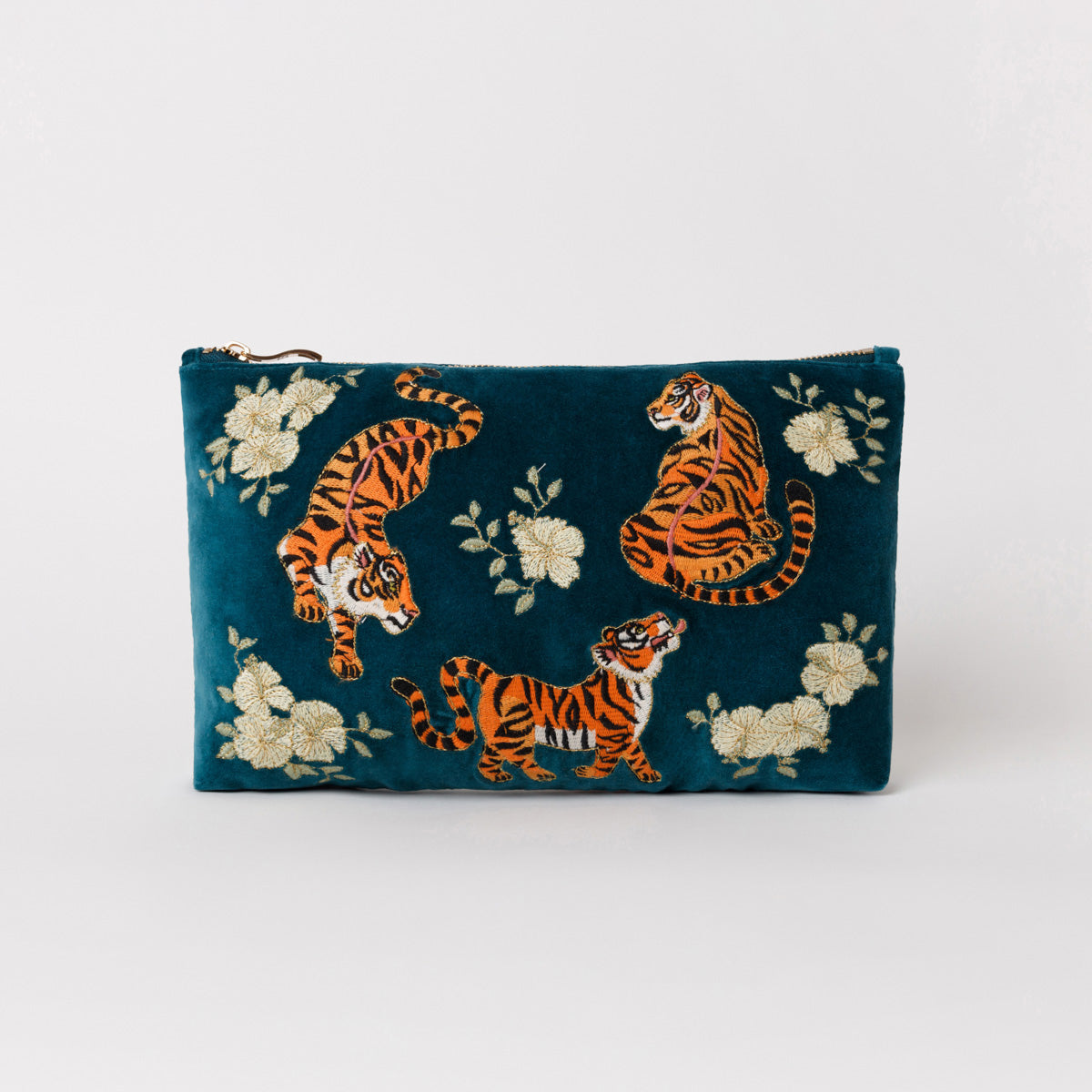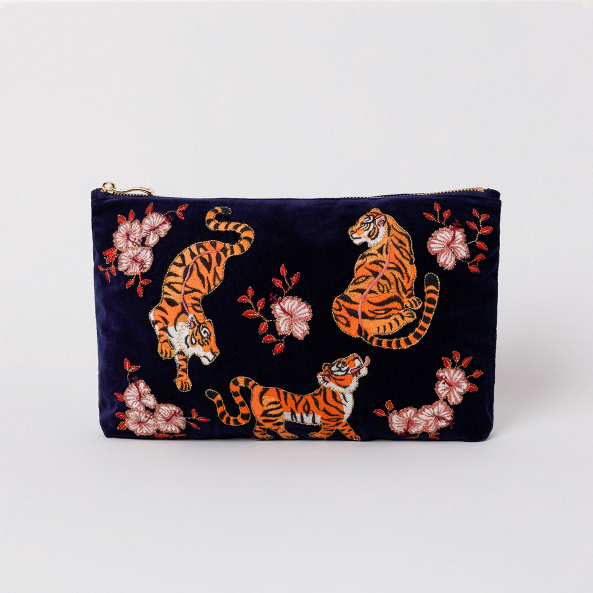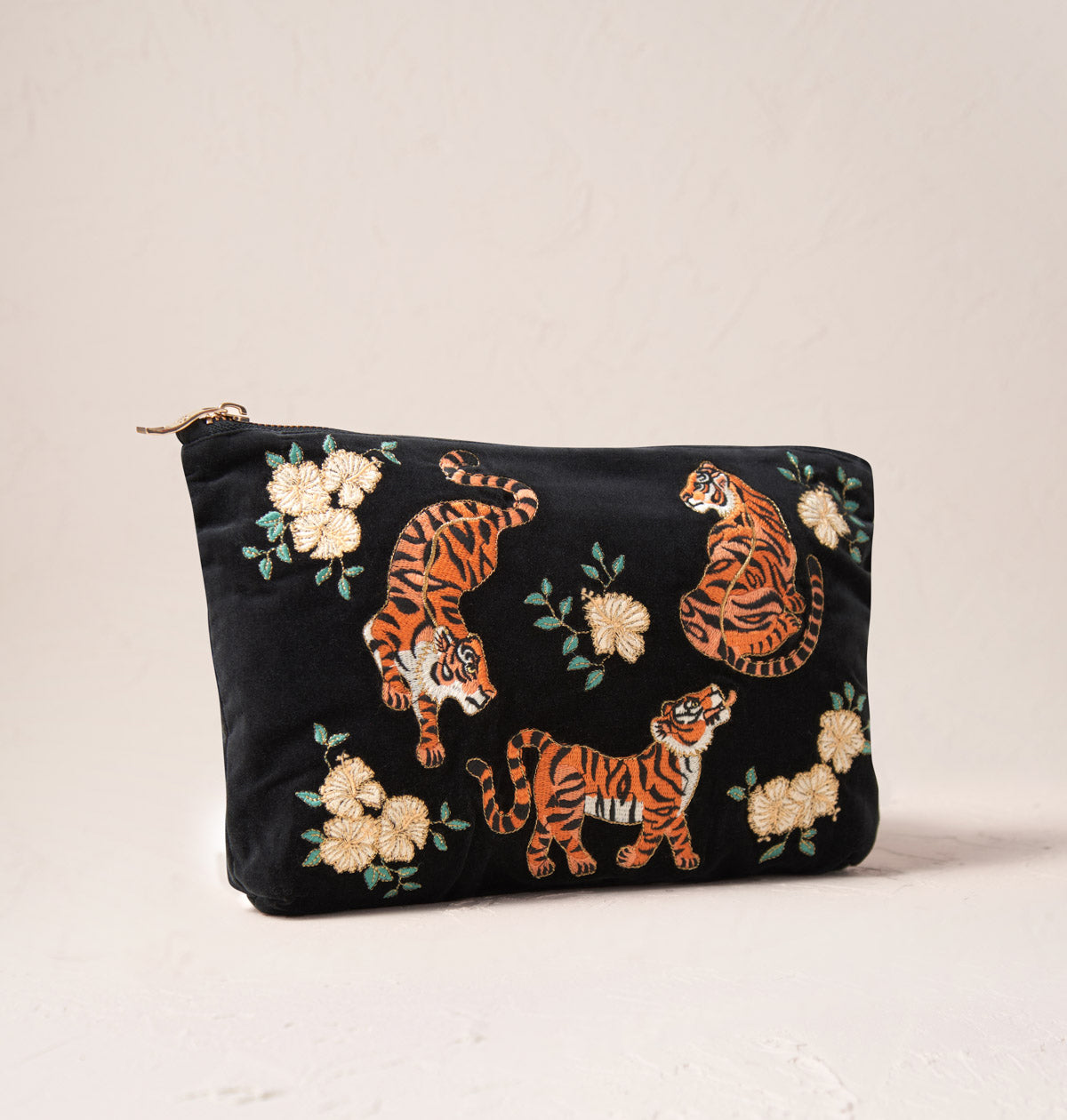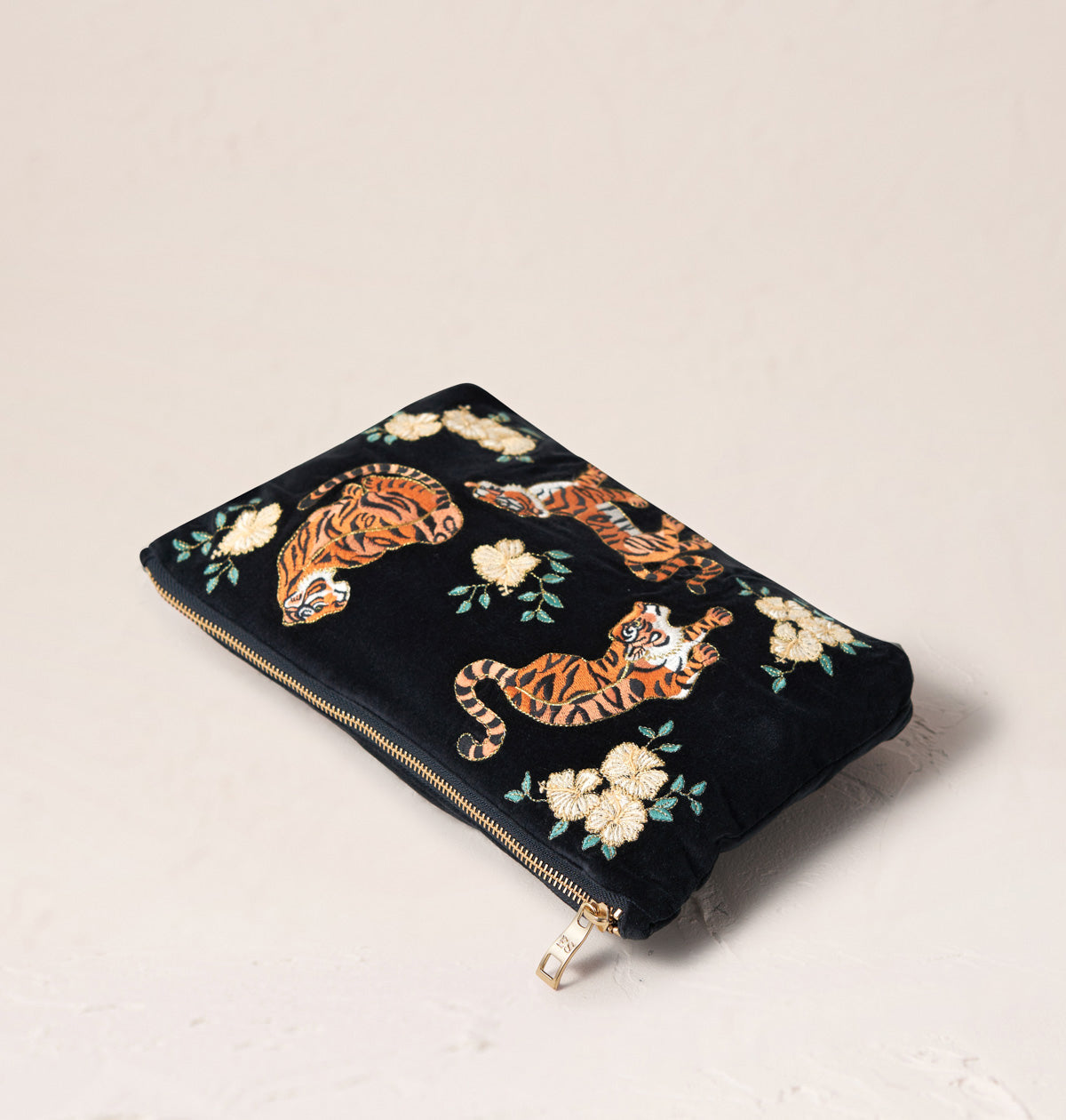 Inspired by the beauty of the Tiger and how they slink their way through the jungle with personality and power, Elizabeth painted these characterful cubs. With their signature black and orange coat and embroidered onto a luxurious velvet base, this striking design is perfect for someone who is independent and charismatic.