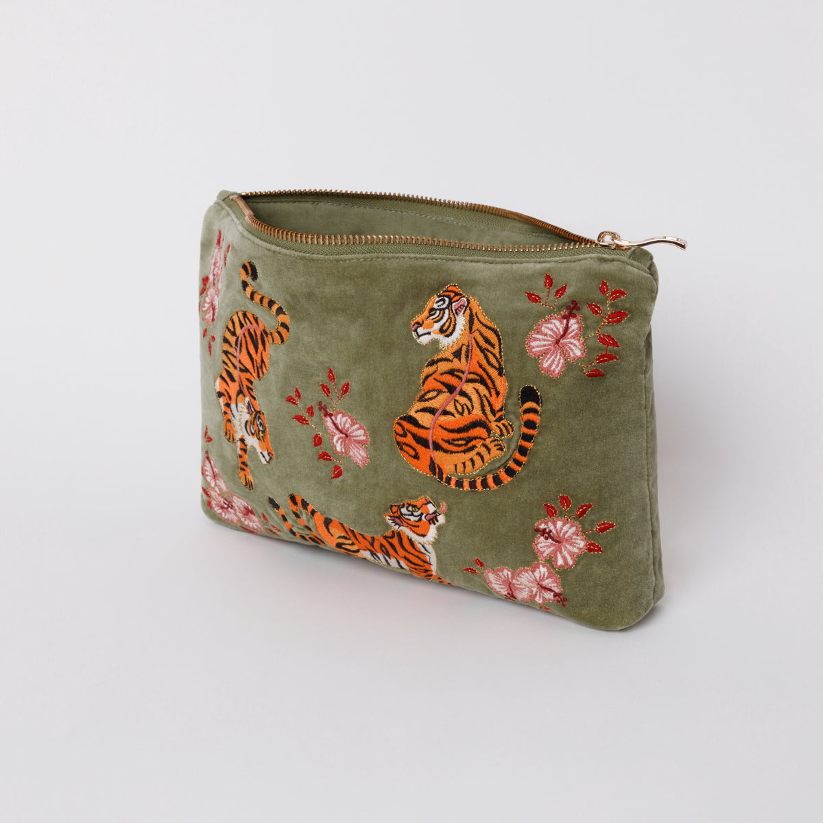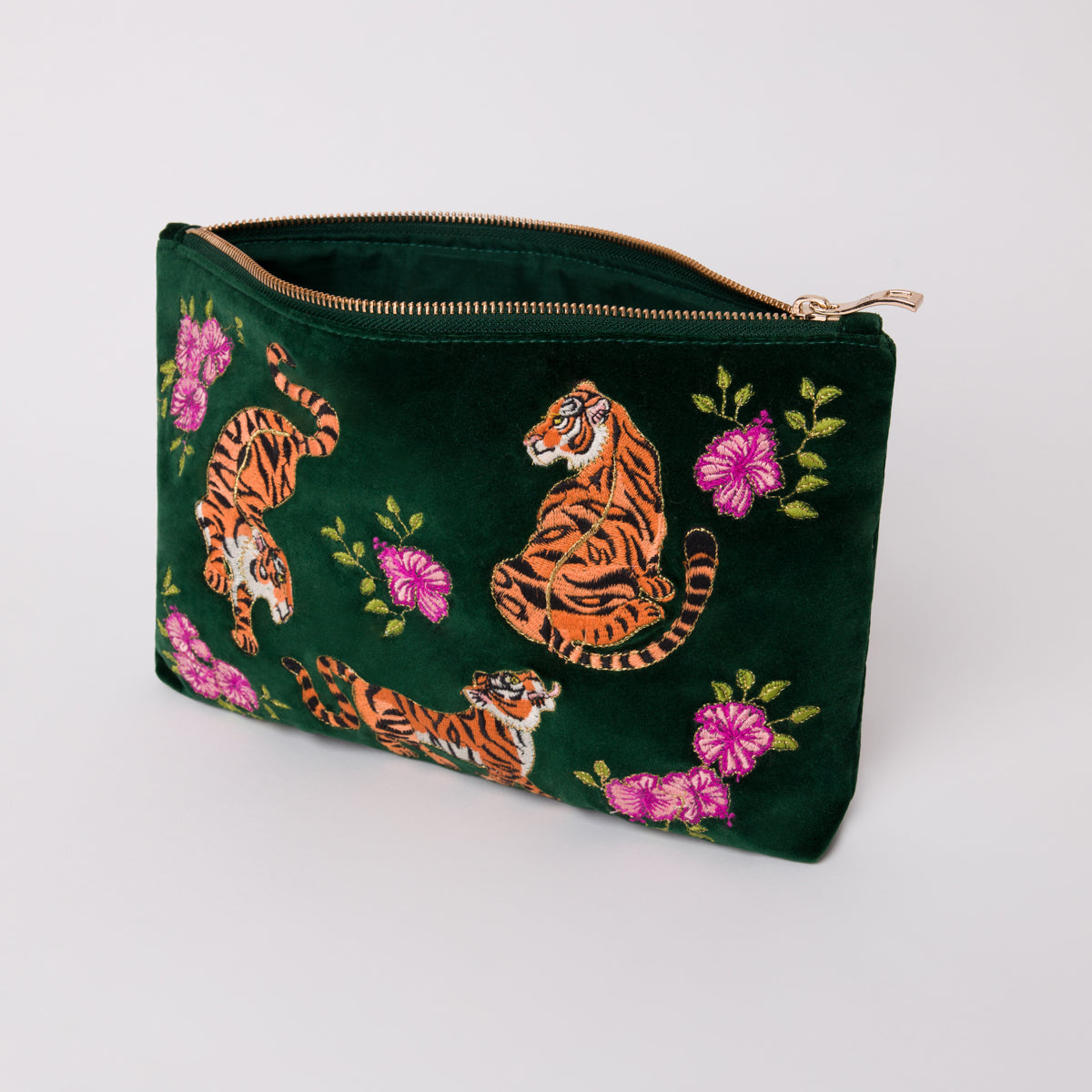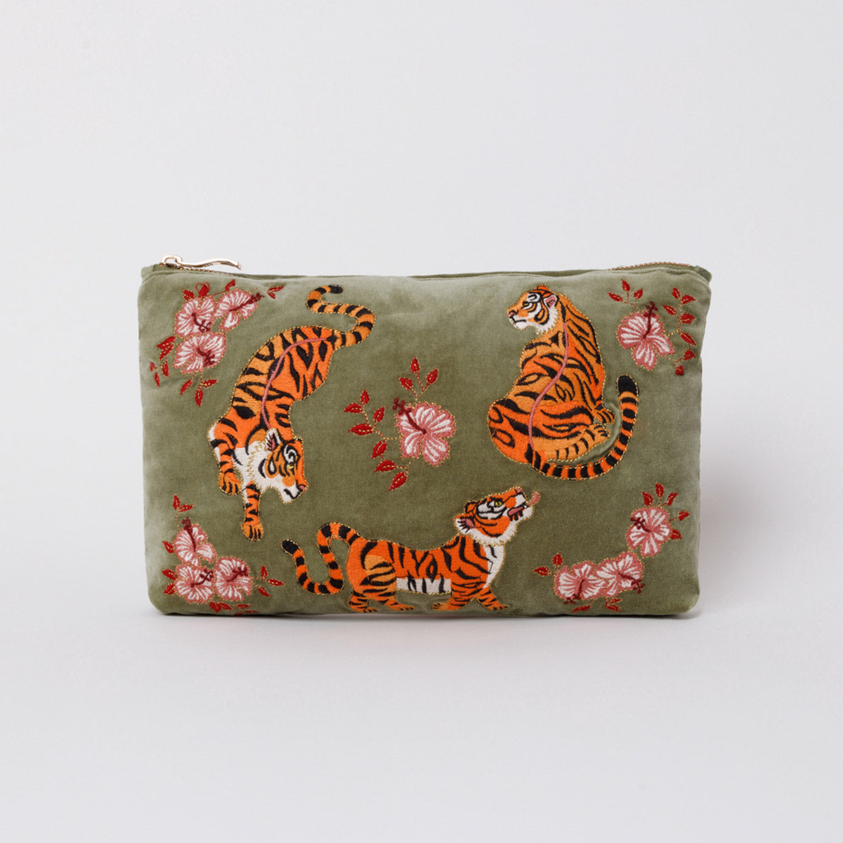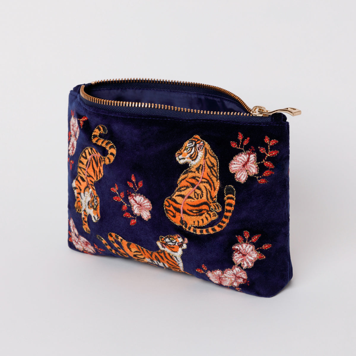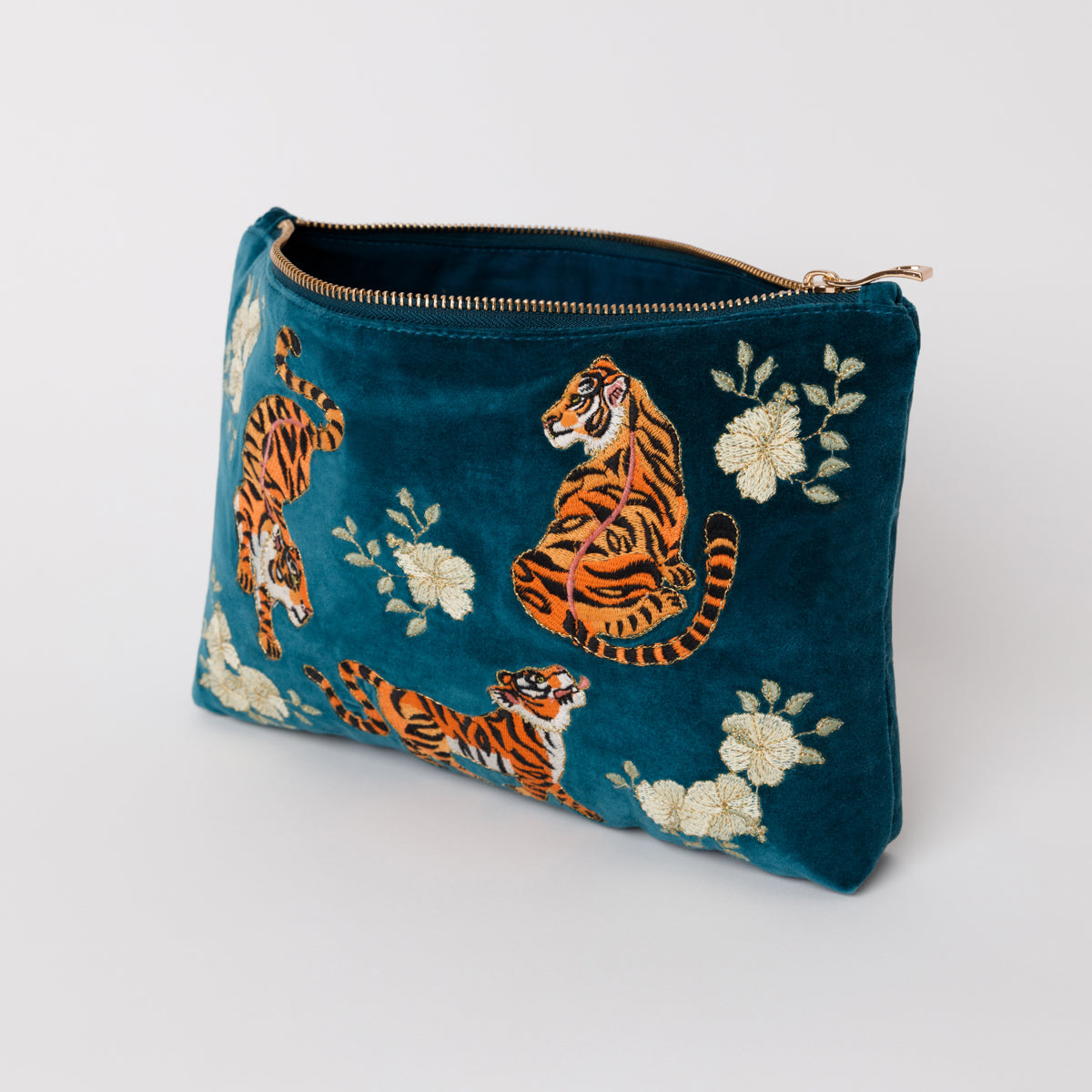 Inspired by the beauty of the Tiger and how they slink their way through the jungle with personality and power, Elizabeth painted these characterful cubs. With their signature black and orange coat and embroidered onto a luxurious velvet base, this striking design is perfect for someone who is independent and charismatic.